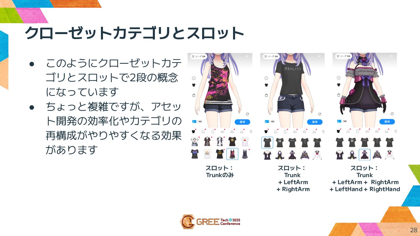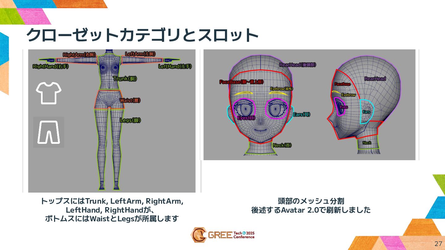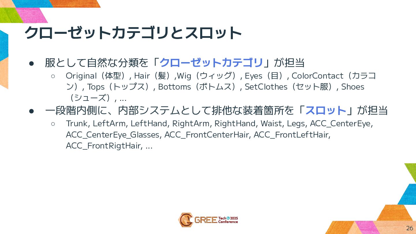 Bottoms(ボトムス), SetClothes(セット服), Shoes (シューズ), ... • 一段階内側に、内部システムとして排他な装着箇所を「スロット」が担当 ◦ Trunk, LeftArm, LeftHand, RightArm, RightHand, Waist, Legs, ACC_CenterEye, ACC_CenterEye_Glasses, ACC_FrontCenterHair, ACC_FrontLeftHair, ACC_FrontRigtHair, ... 26