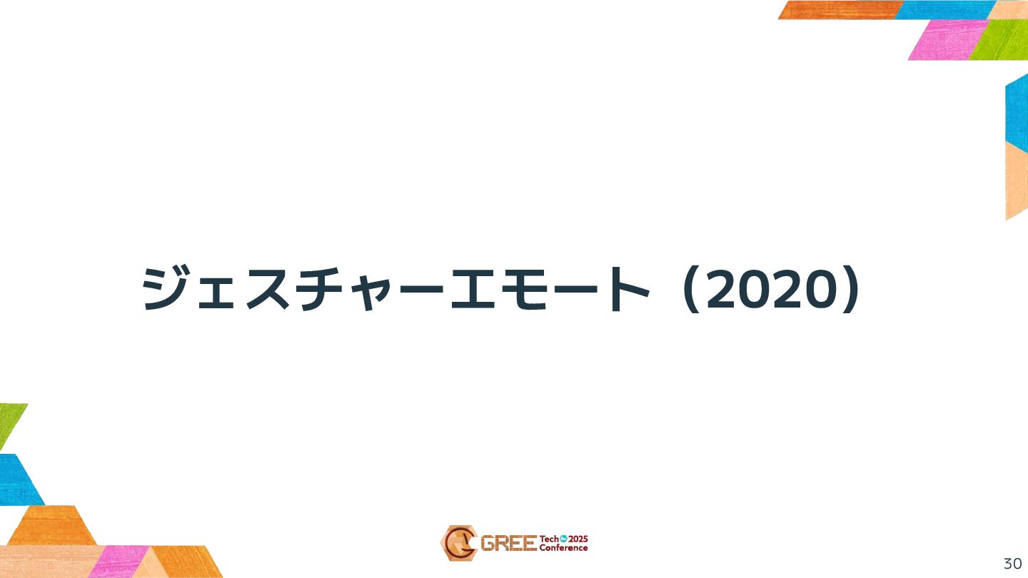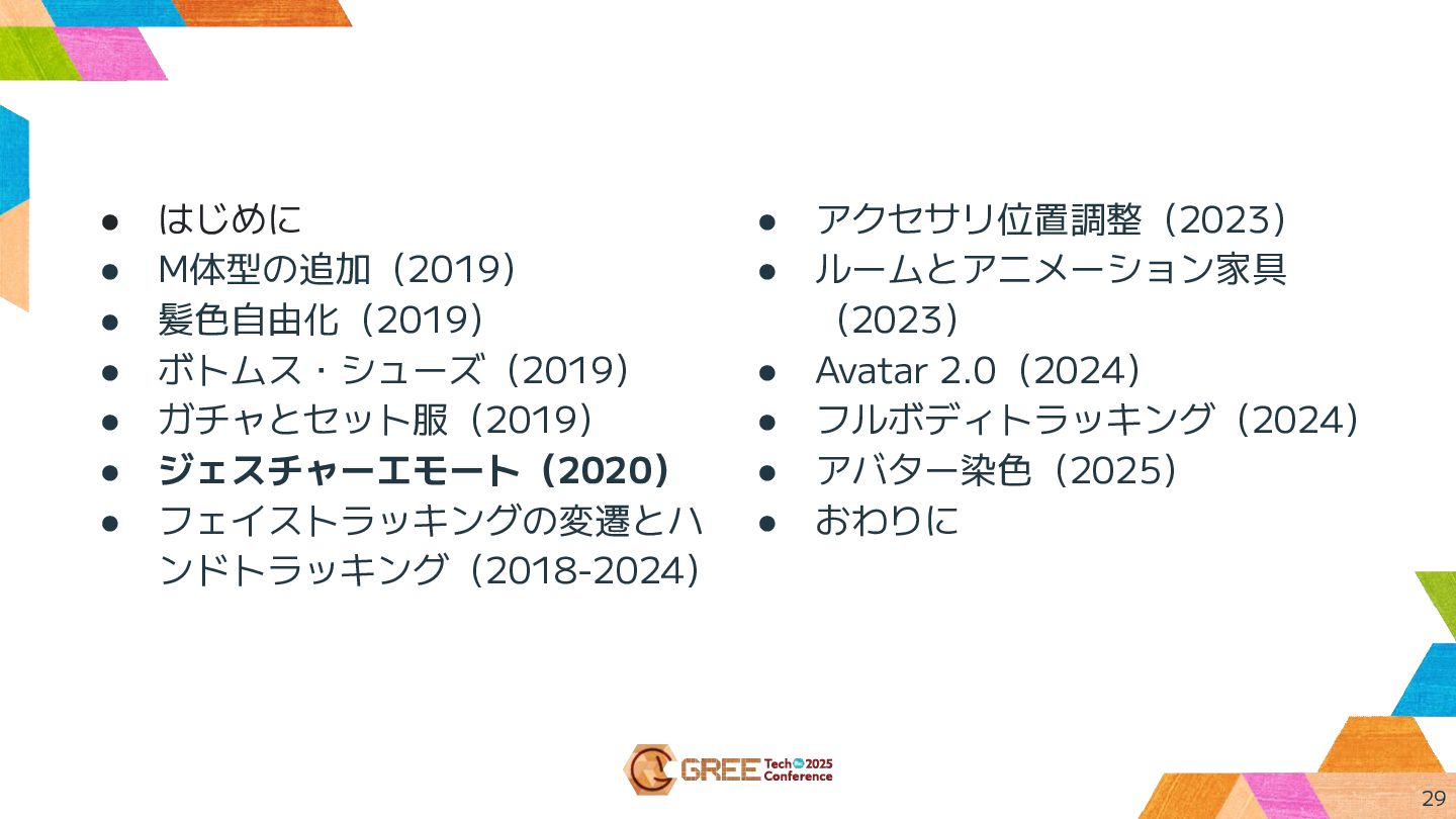 • ジェスチャーエモート(2020) • フェイストラッキングの変遷とハ ンドトラッキング(2018-2024) 29 • アクセサリ位置調整(2023) • ルームとアニメーション家具 (2023) • Avatar 2.0(2024) • フルボディトラッキング(2024) • アバター染色(2025) • おわりに