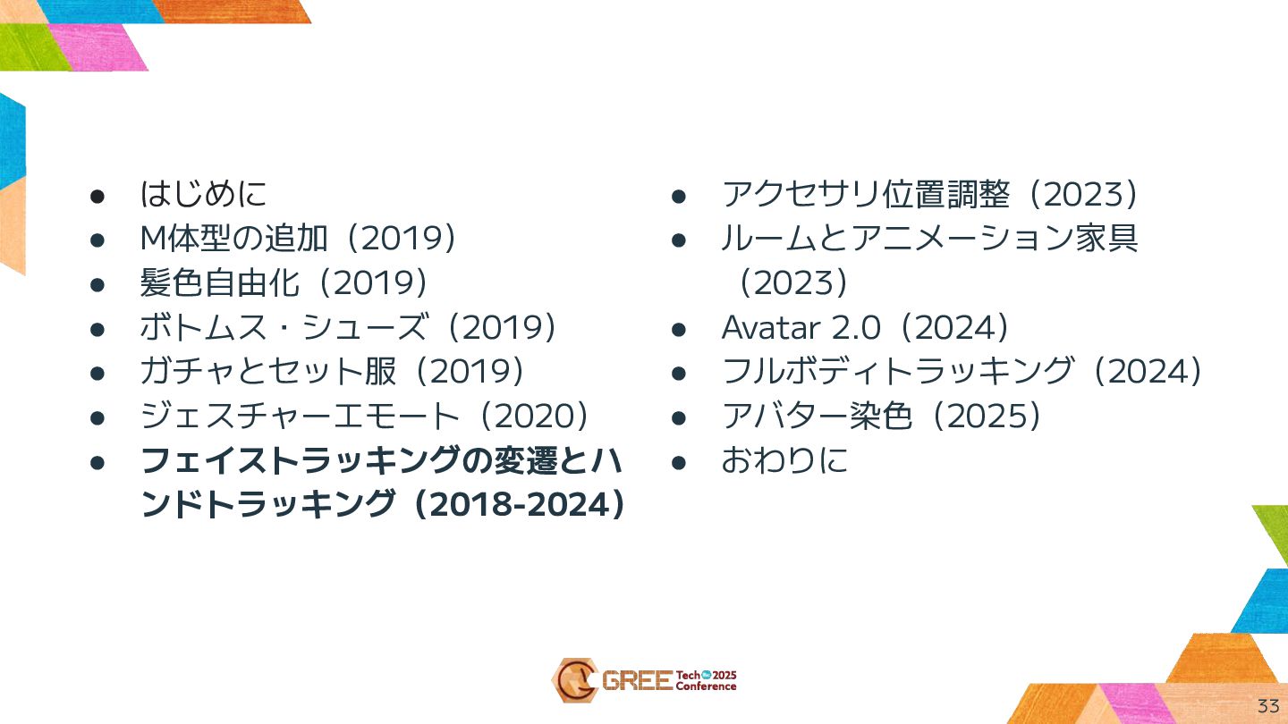 • ジェスチャーエモート(2020) • フェイストラッキングの変遷とハ ンドトラッキング(2018-2024) 33 • アクセサリ位置調整(2023) • ルームとアニメーション家具 (2023) • Avatar 2.0(2024) • フルボディトラッキング(2024) • アバター染色(2025) • おわりに