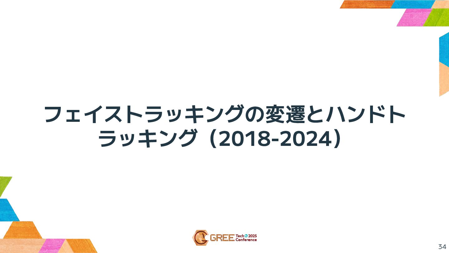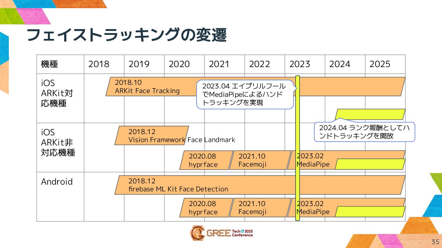 2025 iOS ARKit対 応機種 iOS ARKit非 対応機種 Android 2018.10 ARKit Face Tracking 2018.12 firebase ML Kit Face Detection 2020.08 hyprface 2018.12 Vision Framework Face Landmark 2021.10 Facemoji 2020.08 hyprface 2021.10 Facemoji 2023.04 エイプリルフール でMediaPipeによるハンド トラッキングを実現 2023.02 MediaPipe 2023.02 MediaPipe 2024.04 ランク報酬としてハ ンドトラッキングを開放