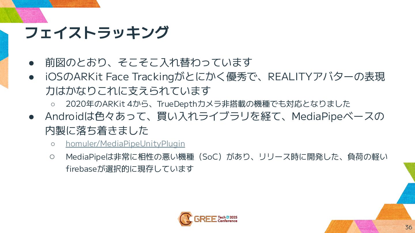 2020年のARKit 4から、TrueDepthカメラ非搭載の機種でも対応となりました • Androidは色々あって、買い入れライブラリを経て、MediaPipeベースの 内製に落ち着きました ◦ homuler/MediaPipeUnityPlugin ◦ MediaPipeは非常に相性の悪い機種(SoC)があり、リリース時に開発した、負荷の軽い firebaseが選択的に現存しています