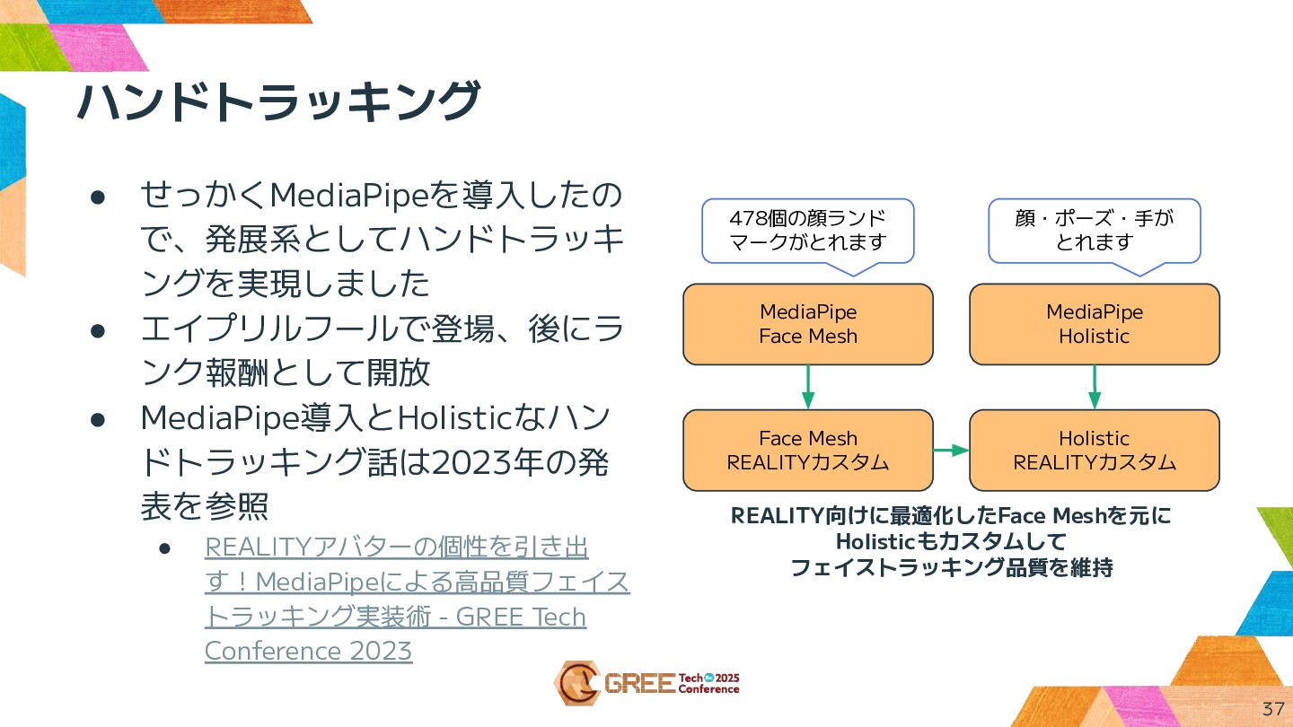 MediaPipe導入とHolisticなハン ドトラッキング話は2023年の発 表を参照 • REALITYアバターの個性を引き出 す!MediaPipeによる高品質フェイス トラッキング実装術 - GREE Tech Conference 2023 MediaPipe Face Mesh Face Mesh REALITYカスタム Holistic REALITYカスタム MediaPipe Holistic REALITY向けに最適化したFace Meshを元に Holisticもカスタムして フェイストラッキング品質を維持 478個の顔ランド マークがとれます 顔・ポーズ・手が とれます