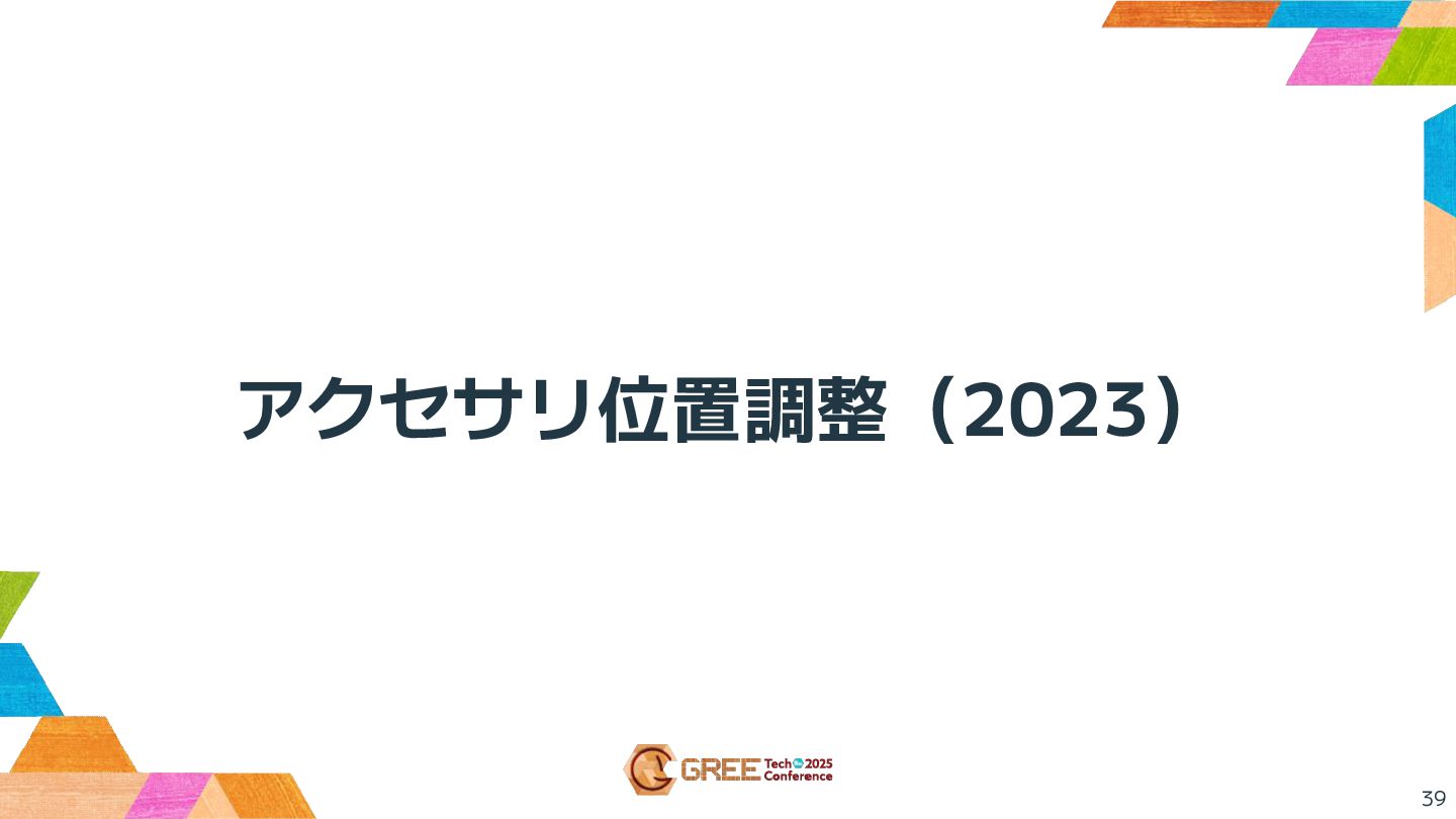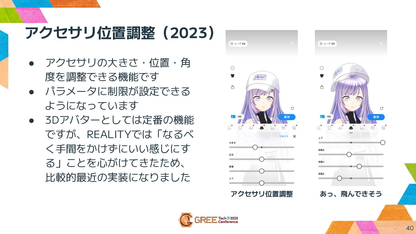 く手間をかけずにいい感じにす る」ことを心がけてきたため、 比較的最近の実装になりました 40 アクセサリ位置調整 あっ、飛んできそう