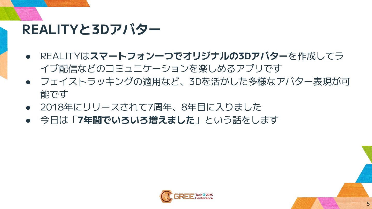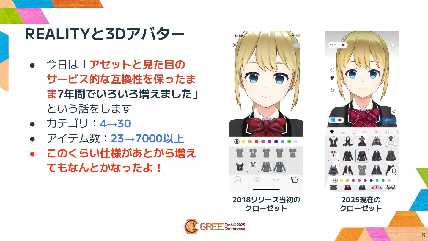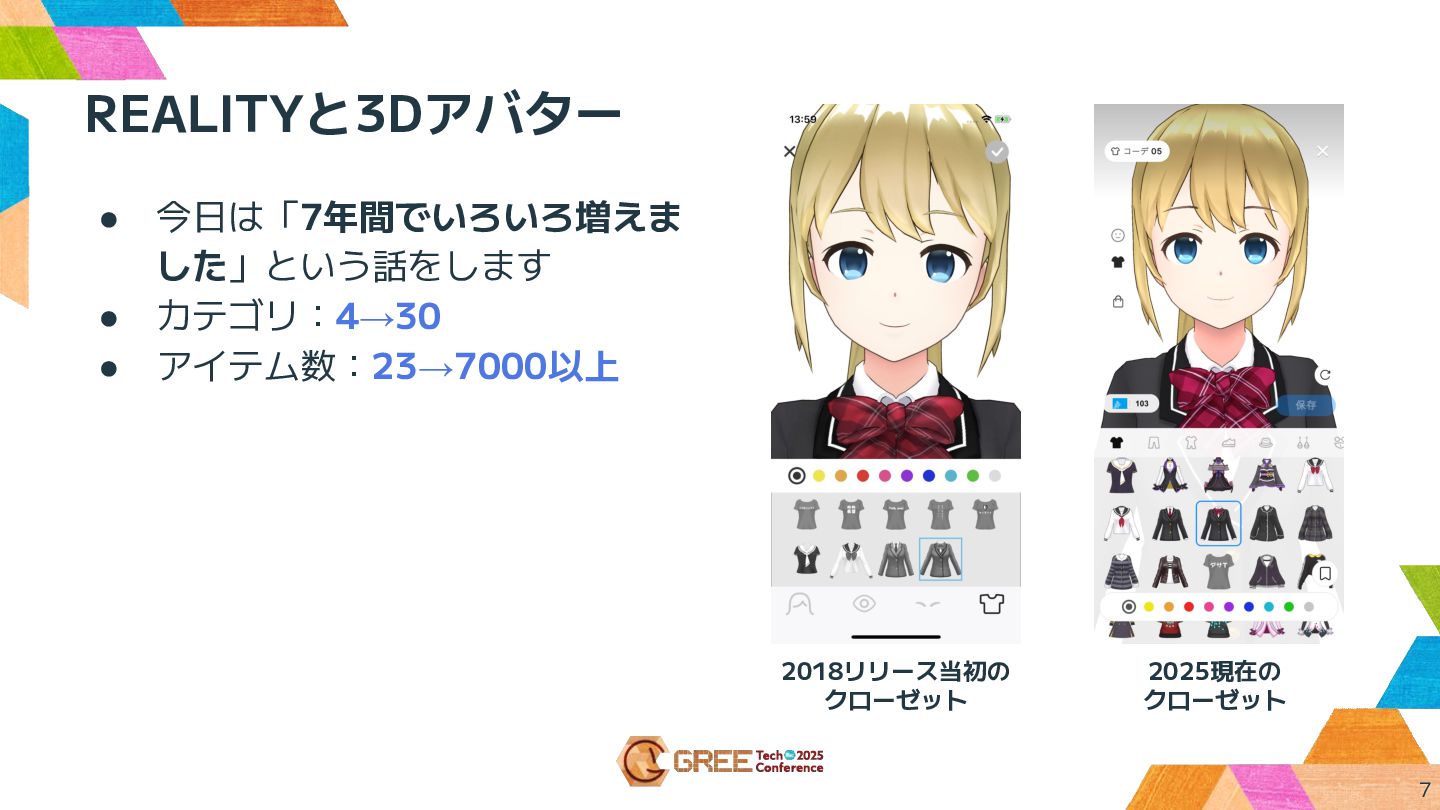 2. REALITYと3Dアバター • 今日は「アセットと見た目の サービス的な互換性を保ったま ま7年間でいろいろ増えました」 という話をします • カテゴリ:4→30 • アイテム数:23→7000以上