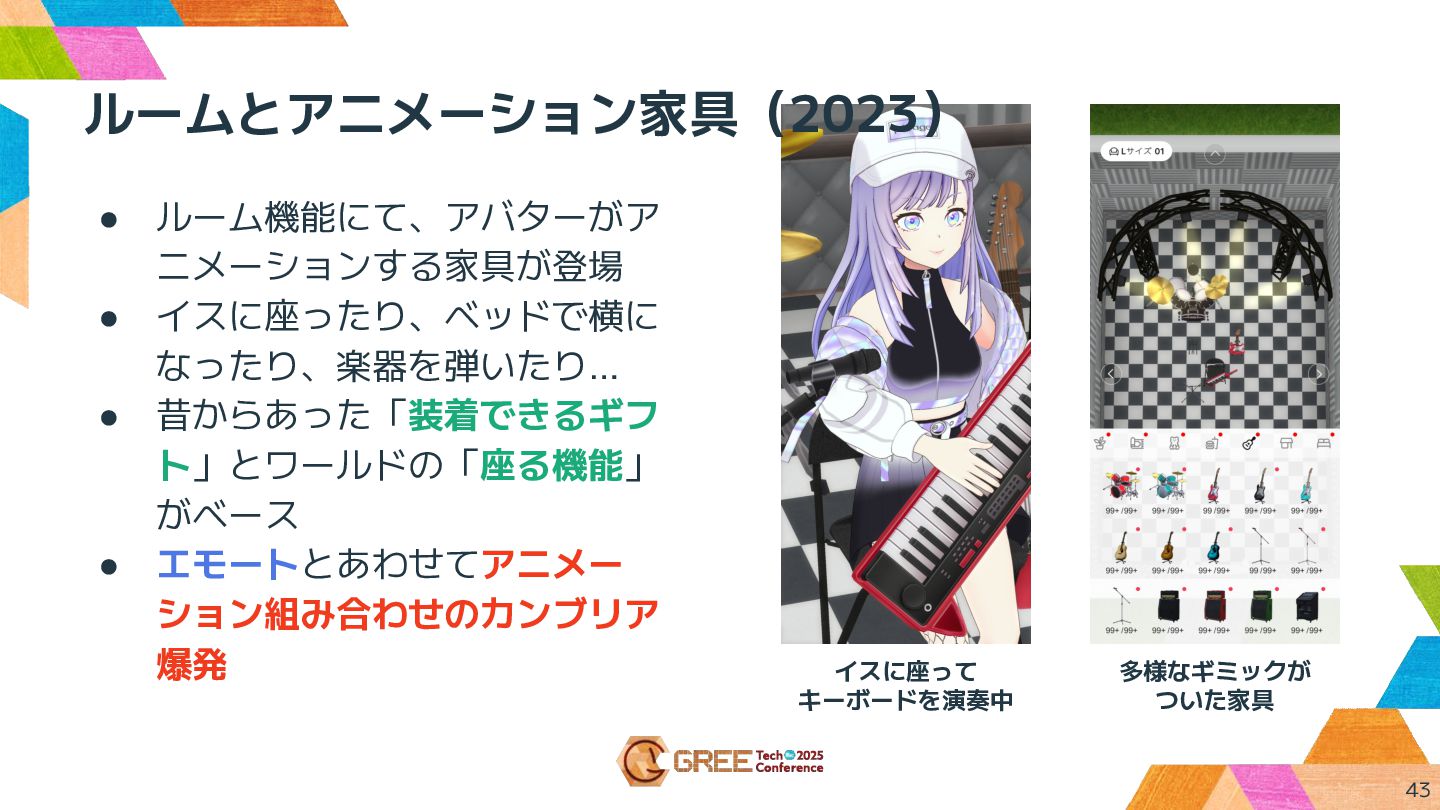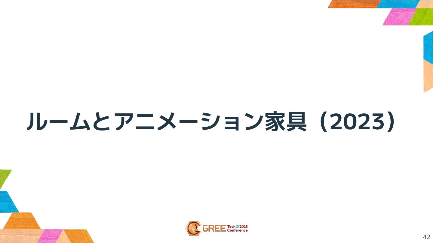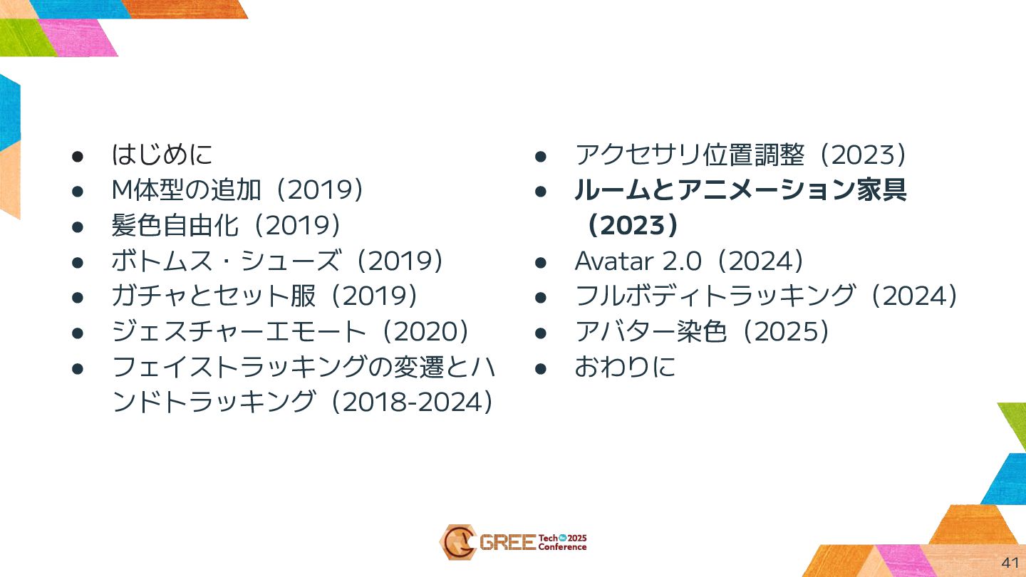 • ジェスチャーエモート(2020) • フェイストラッキングの変遷とハ ンドトラッキング(2018-2024) 41 • アクセサリ位置調整(2023) • ルームとアニメーション家具 (2023) • Avatar 2.0(2024) • フルボディトラッキング(2024) • アバター染色(2025) • おわりに