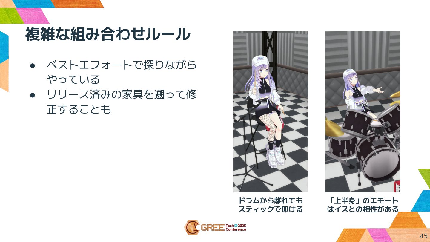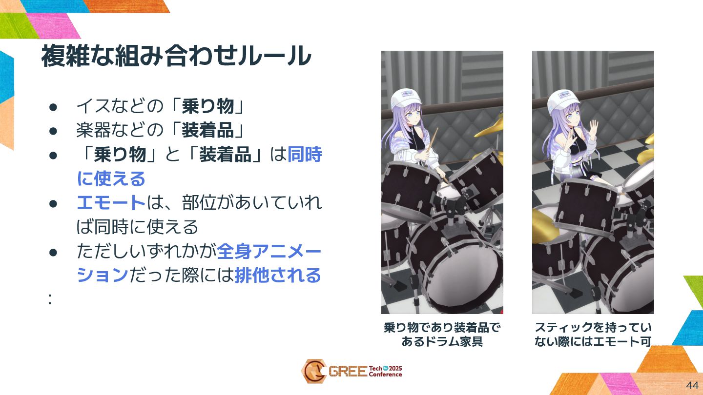 ば同時に使える • ただしいずれかが全身アニメー ションだった際には排他される : 44 乗り物であり装着品で あるドラム家具 スティックを持ってい ない際にはエモート可