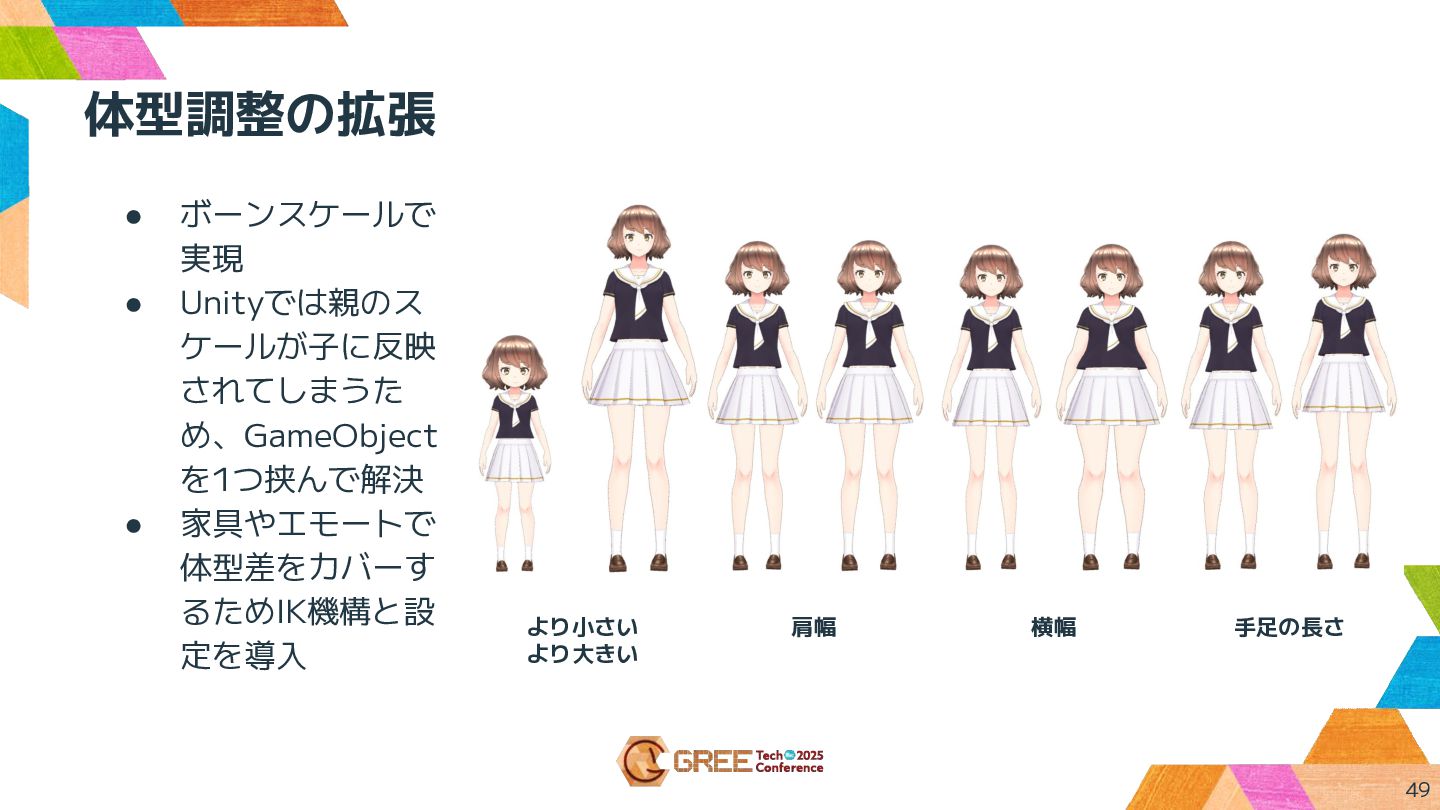 • Unityでは親のス ケールが子に反映 されてしまうた め、GameObject を1つ挟んで解決 • 家具やエモートで 体型差をカバーす るためIK機構と設 定を導入