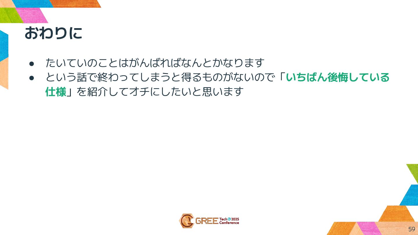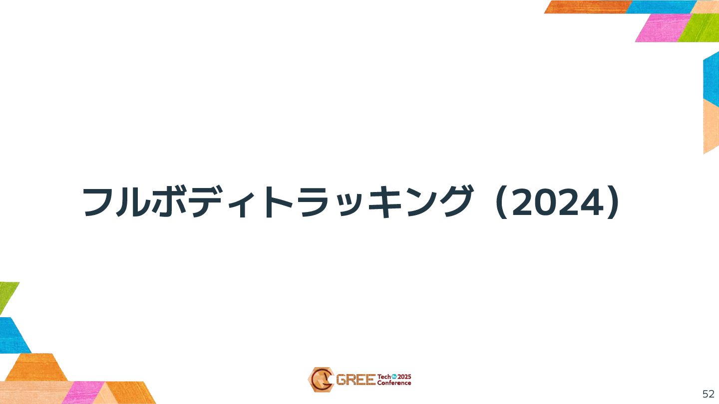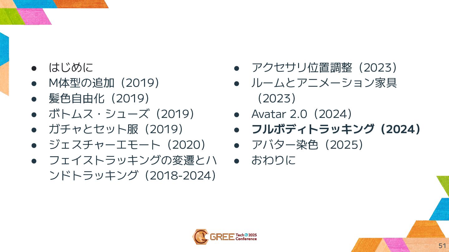 • ジェスチャーエモート(2020) • フェイストラッキングの変遷とハ ンドトラッキング(2018-2024) 51 • アクセサリ位置調整(2023) • ルームとアニメーション家具 (2023) • Avatar 2.0(2024) • フルボディトラッキング(2024) • アバター染色(2025) • おわりに