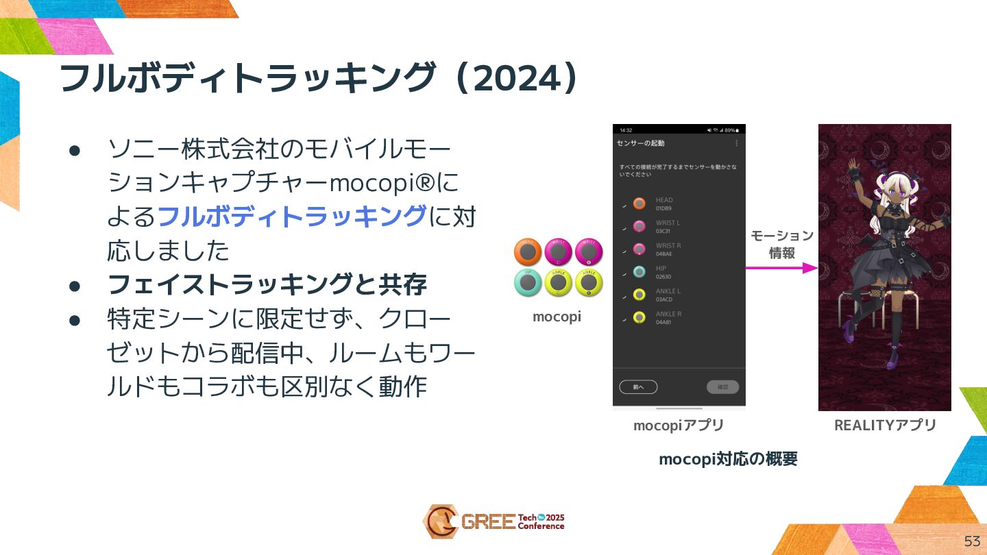 25. フルボディトラッキング(2024) 53 • ソニー株式会社のモバイルモー ションキャプチャーmocopi®に よるフルボディトラッキングに対 応しました • フェイストラッキングと共存 •