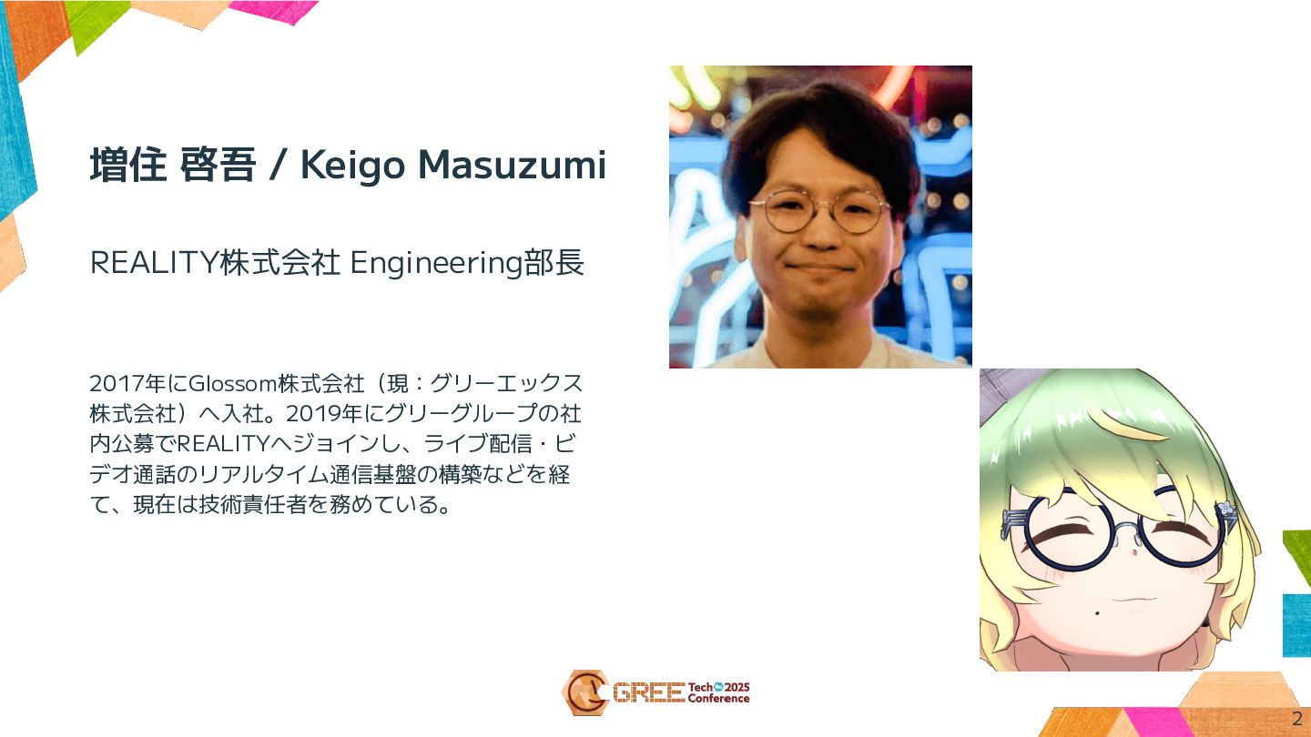 増住 啓吾 / Keigo Masuzumi 2017年にGlossom株式会社(現:グリーエックス 株式会社)へ入社。2019年にグリーグループの社 内公募でREALITYへジョインし、ライブ配信・ビ デオ通話のリアルタイム通信基盤の構築などを経 て、現在は技術責任者を務めている。