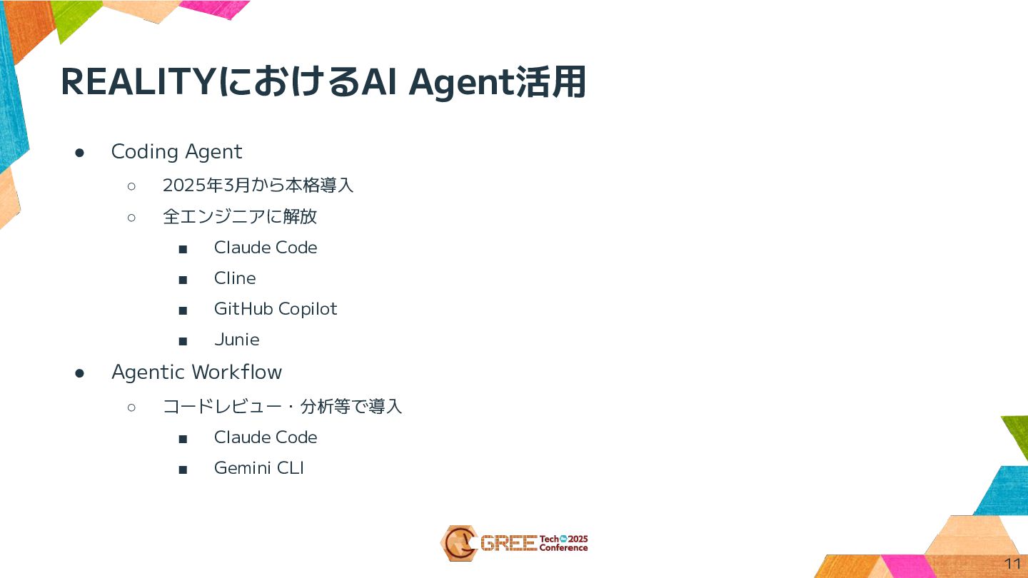 REALITYにおけるAI Agent活用 • Coding Agent ◦ 2025年3月から本格導入 ◦ 全エンジニアに解放 ▪