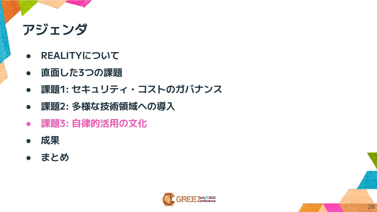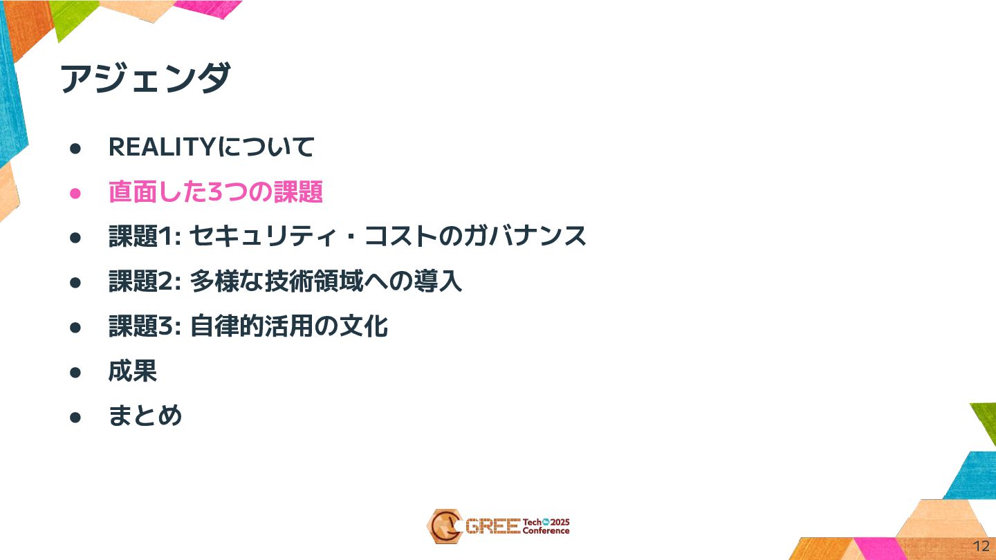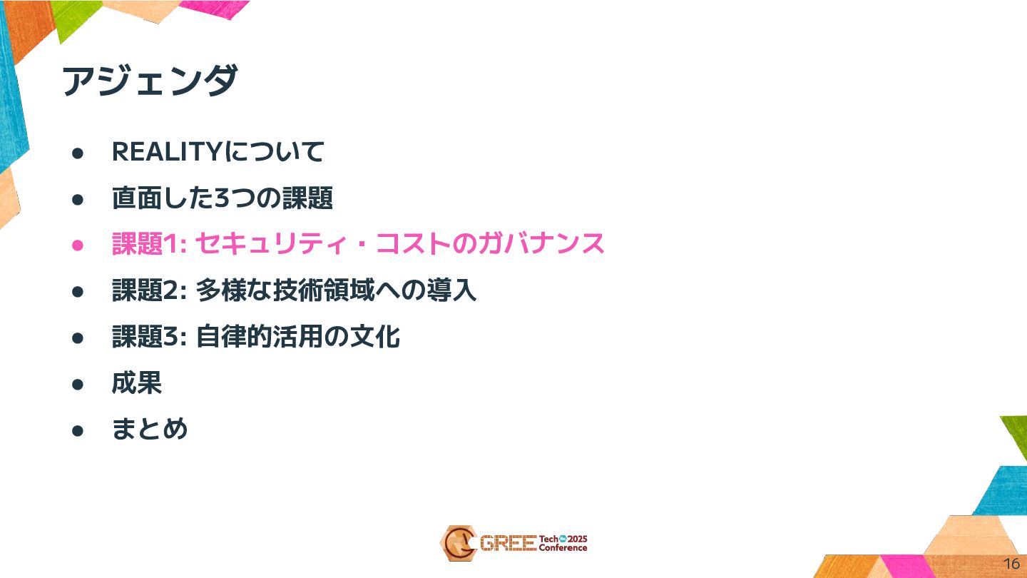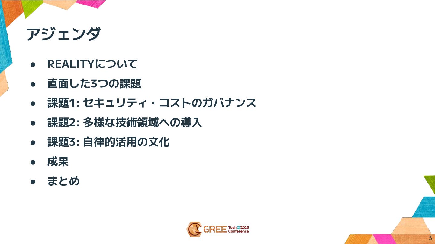 アジェンダ • REALITYについて • 直面した3つの課題 • 課題1: セキュリティ・コストのガバナンス • 課題2: