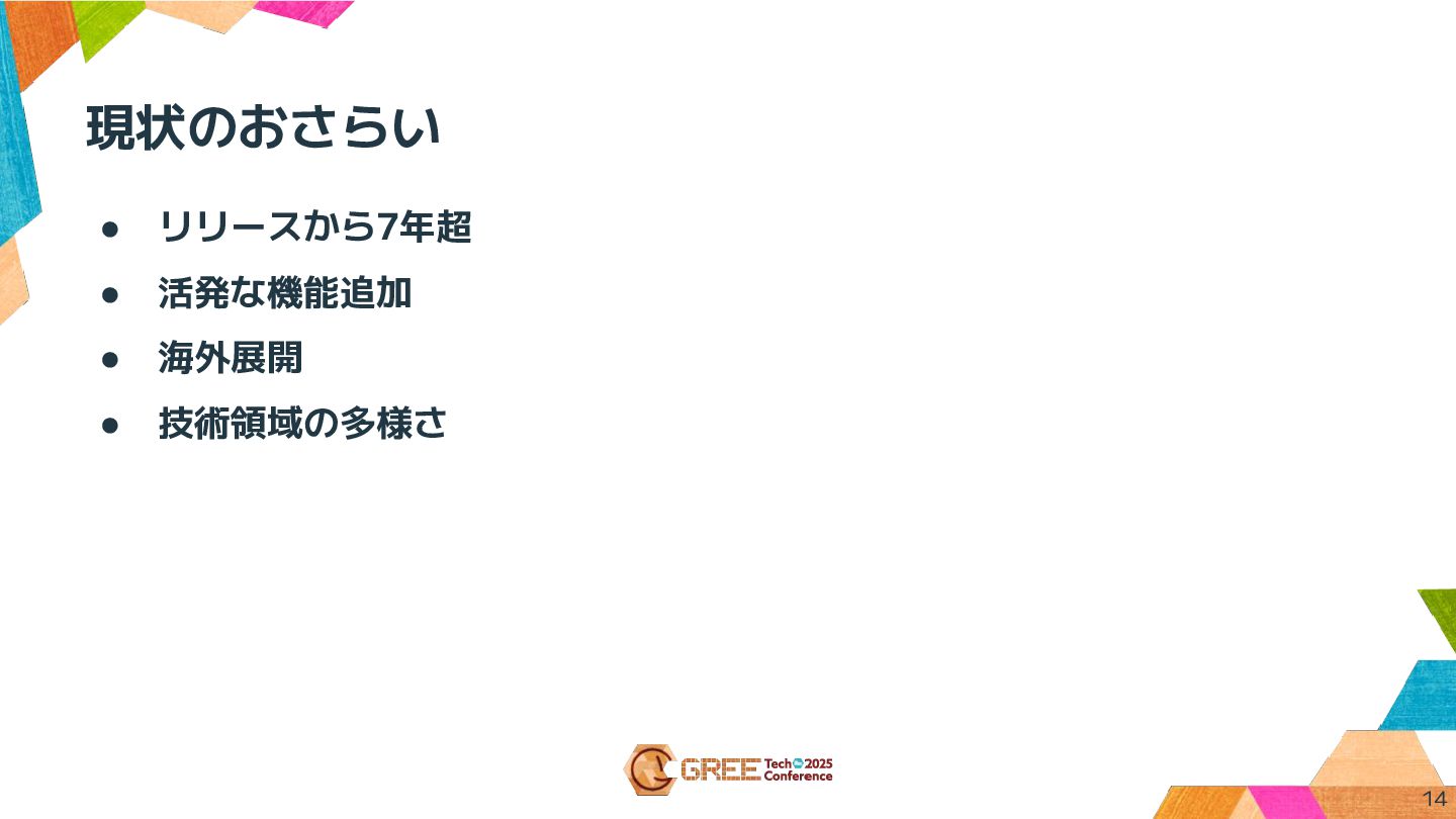 現状のおさらい • リリースから7年超 • 活発な機能追加 • 海外展開 • 技術領域の多様さ 14