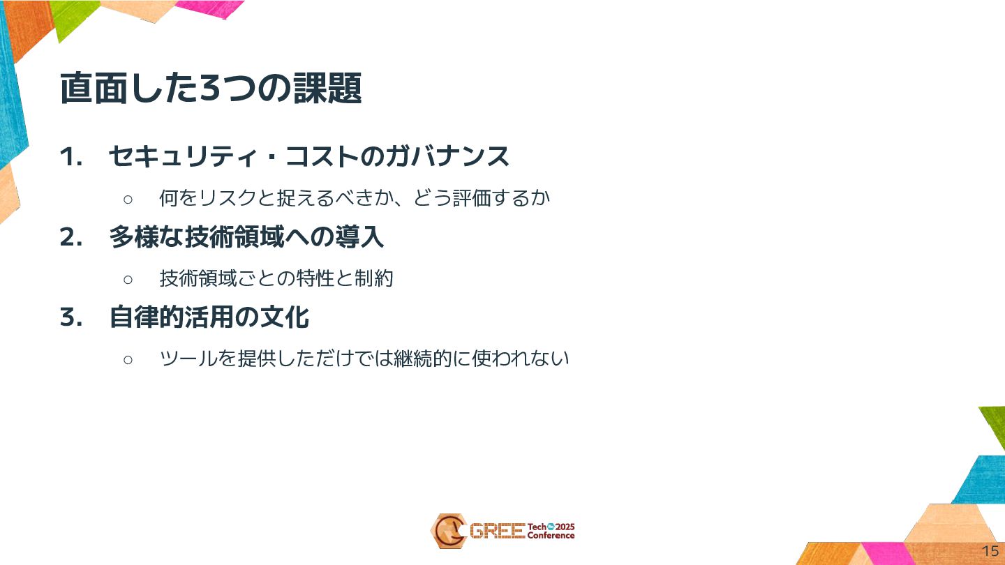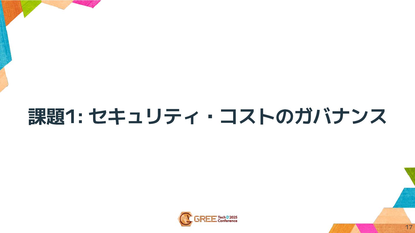 直面した3つの課題 1. セキュリティ・コストのガバナンス ◦ 何をリスクと捉えるべきか、どう評価するか 2. 多様な技術領域への導入 ◦ 技術領域ごとの特性と制約 3.
