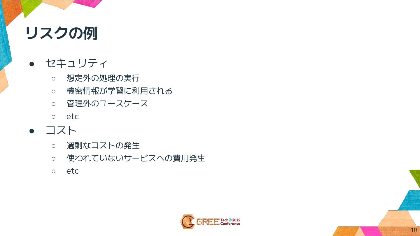 リスクの例 • セキュリティ ◦ 想定外の処理の実行 ◦ 機密情報が学習に利用される ◦ 管理外のユースケース ◦