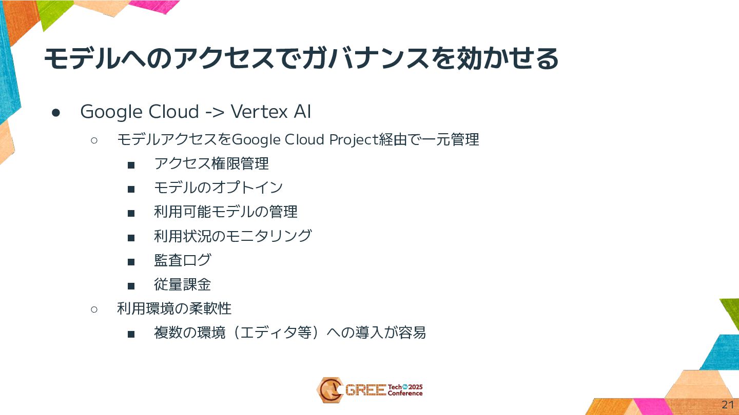 Project経由で一元管理 ▪ アクセス権限管理 ▪ モデルのオプトイン ▪ 利用可能モデルの管理 ▪ 利用状況のモニタリング ▪ 監査ログ ▪ 従量課金 ◦ 利用環境の柔軟性 ▪ 複数の環境(エディタ等)への導入が容易 21