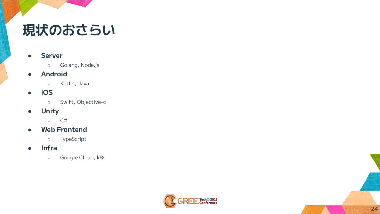 Java • iOS ◦ Swift, Objective-c • Unity ◦ C# • Web Frontend ◦ TypeScript • Infra ◦ Google Cloud, k8s 24