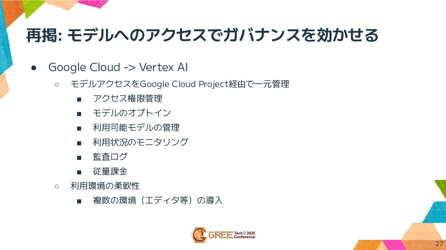 再掲: モデルへのアクセスでガバナンスを効かせる • Google Cloud -> Vertex AI ◦ モデルアクセスをGoogle