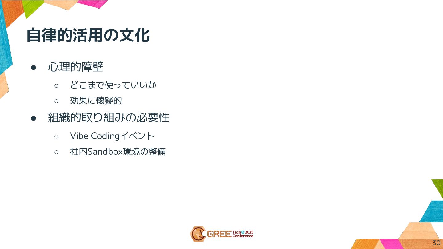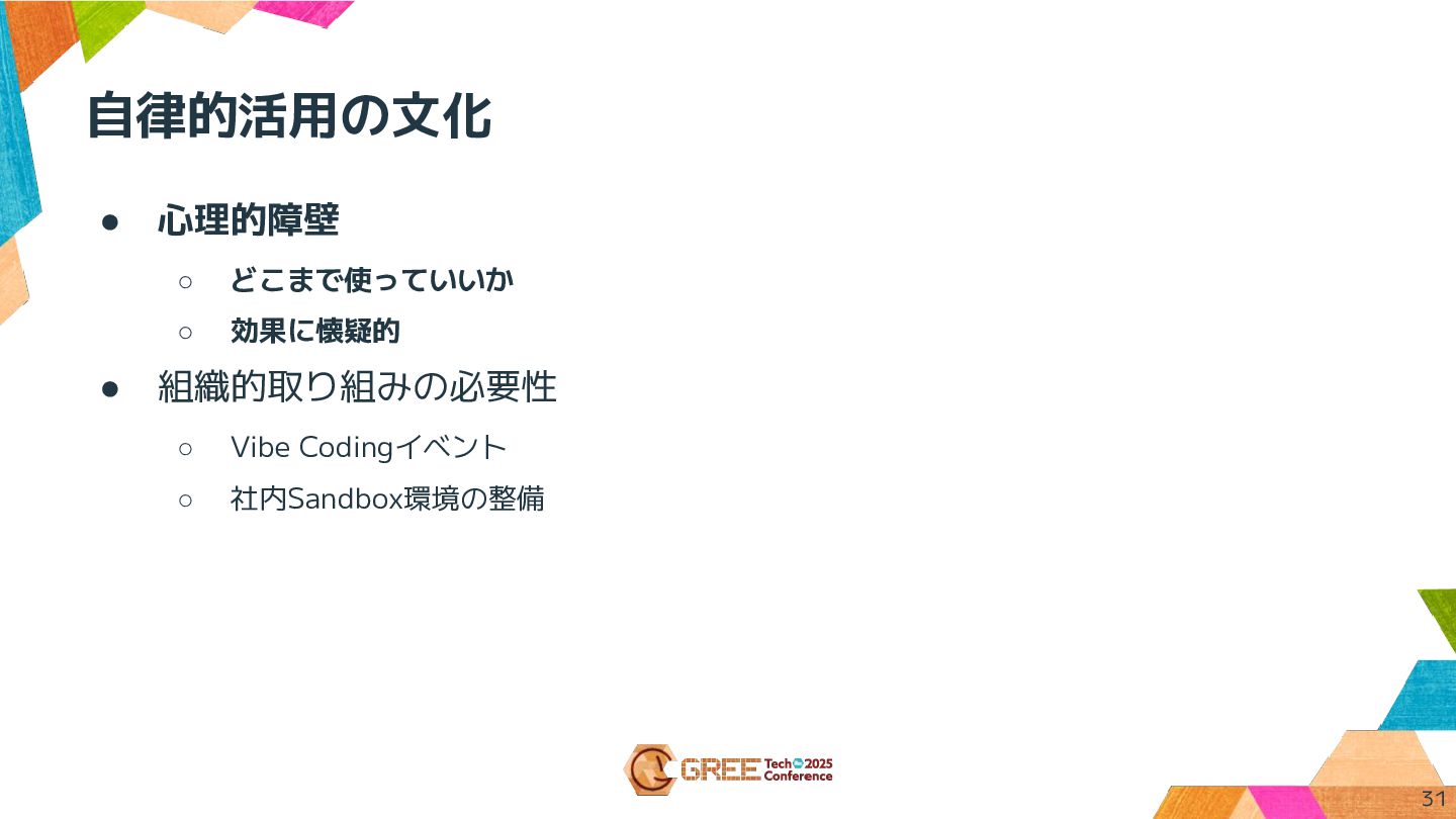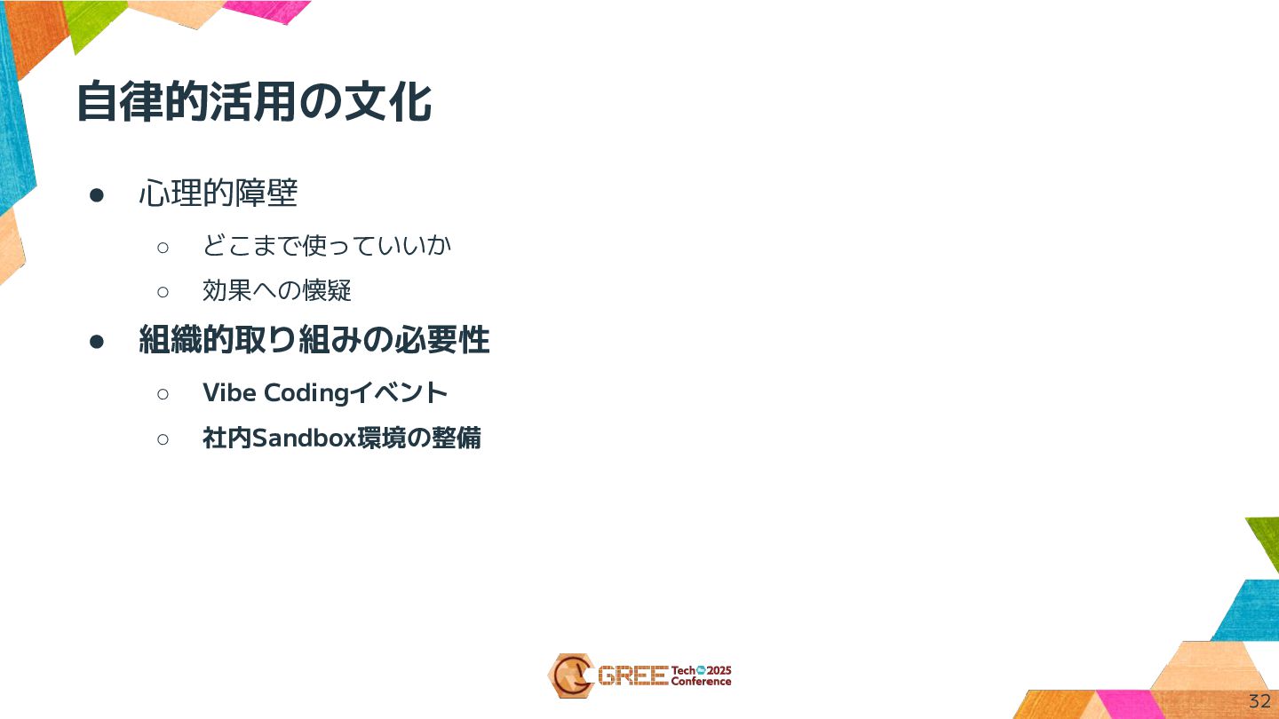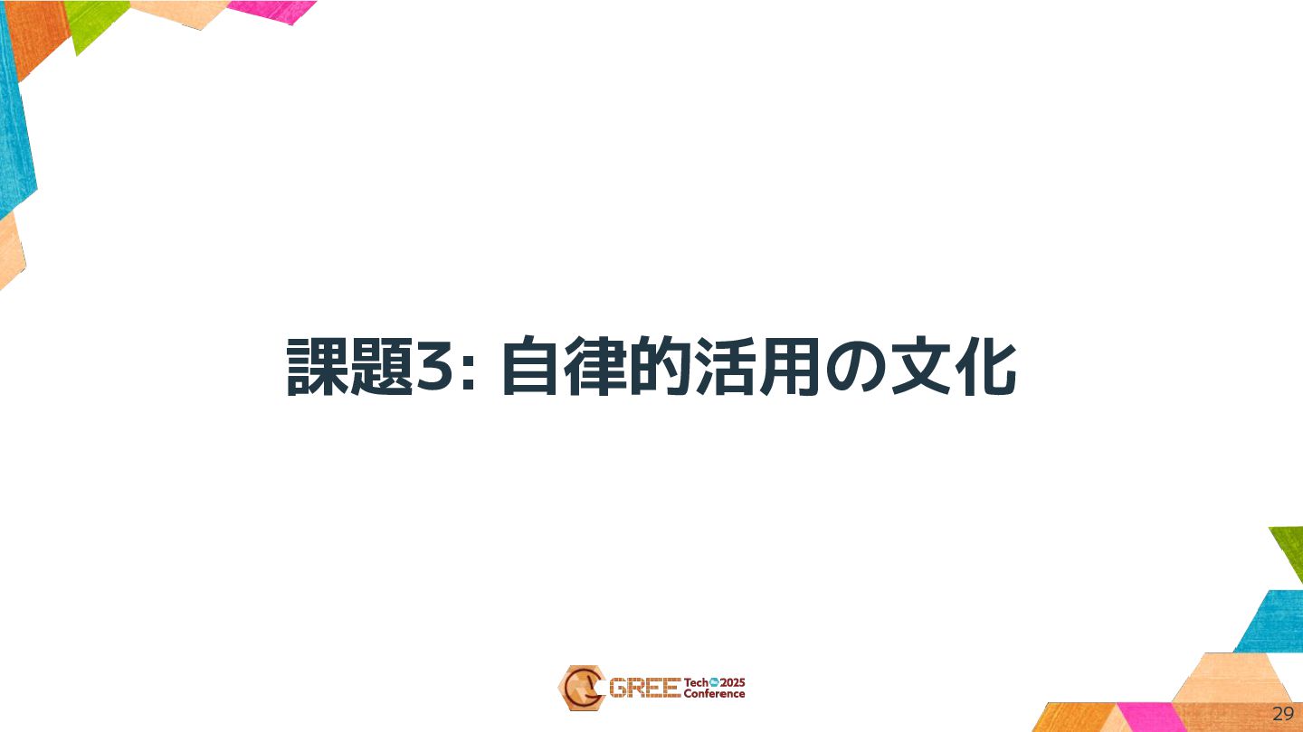 自律的活用の文化 • 心理的障壁 ◦ どこまで使っていいか ◦ 効果に懐疑的 • 組織的取り組みの必要性 ◦