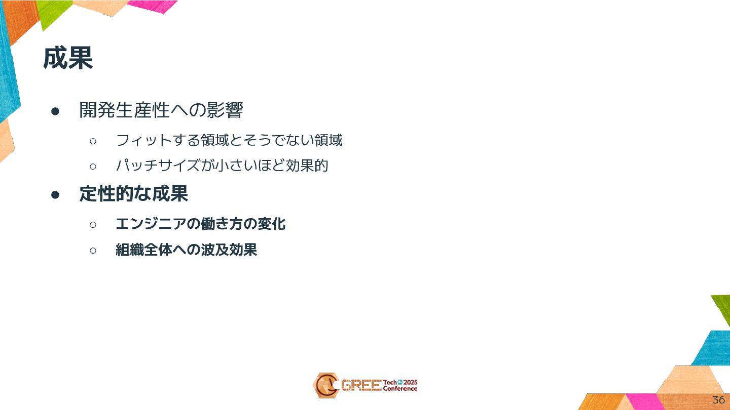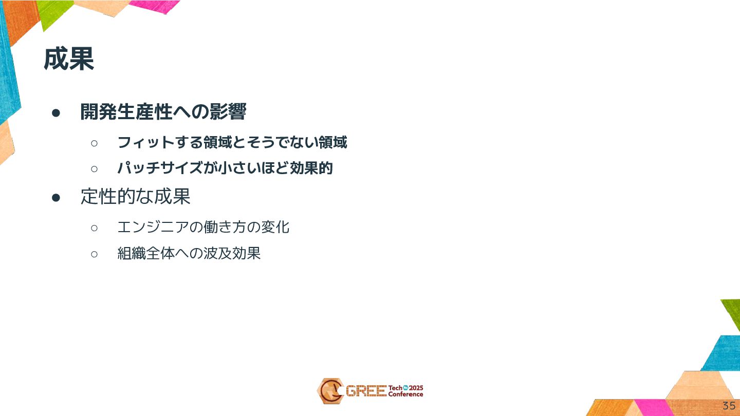 成果 • 開発生産性への影響 ◦ フィットする領域とそうでない領域 ◦ パッチサイズが小さいほど効果的 • 定性的な成果 ◦