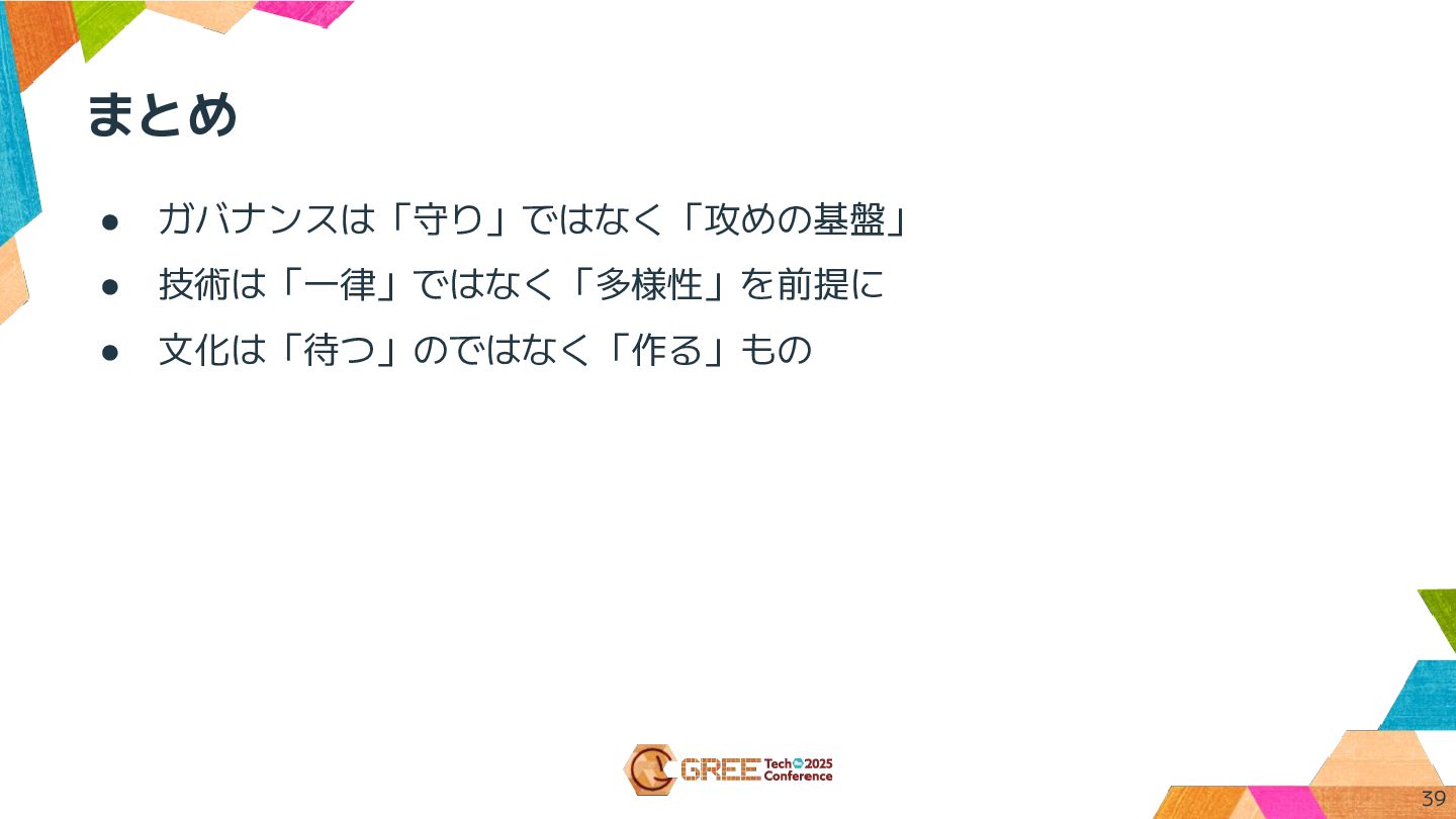 まとめ • ガバナンスは「守り」ではなく「攻めの基盤」 • 技術は「一律」ではなく「多様性」を前提に • 文化は「待つ」のではなく「作る」もの 39