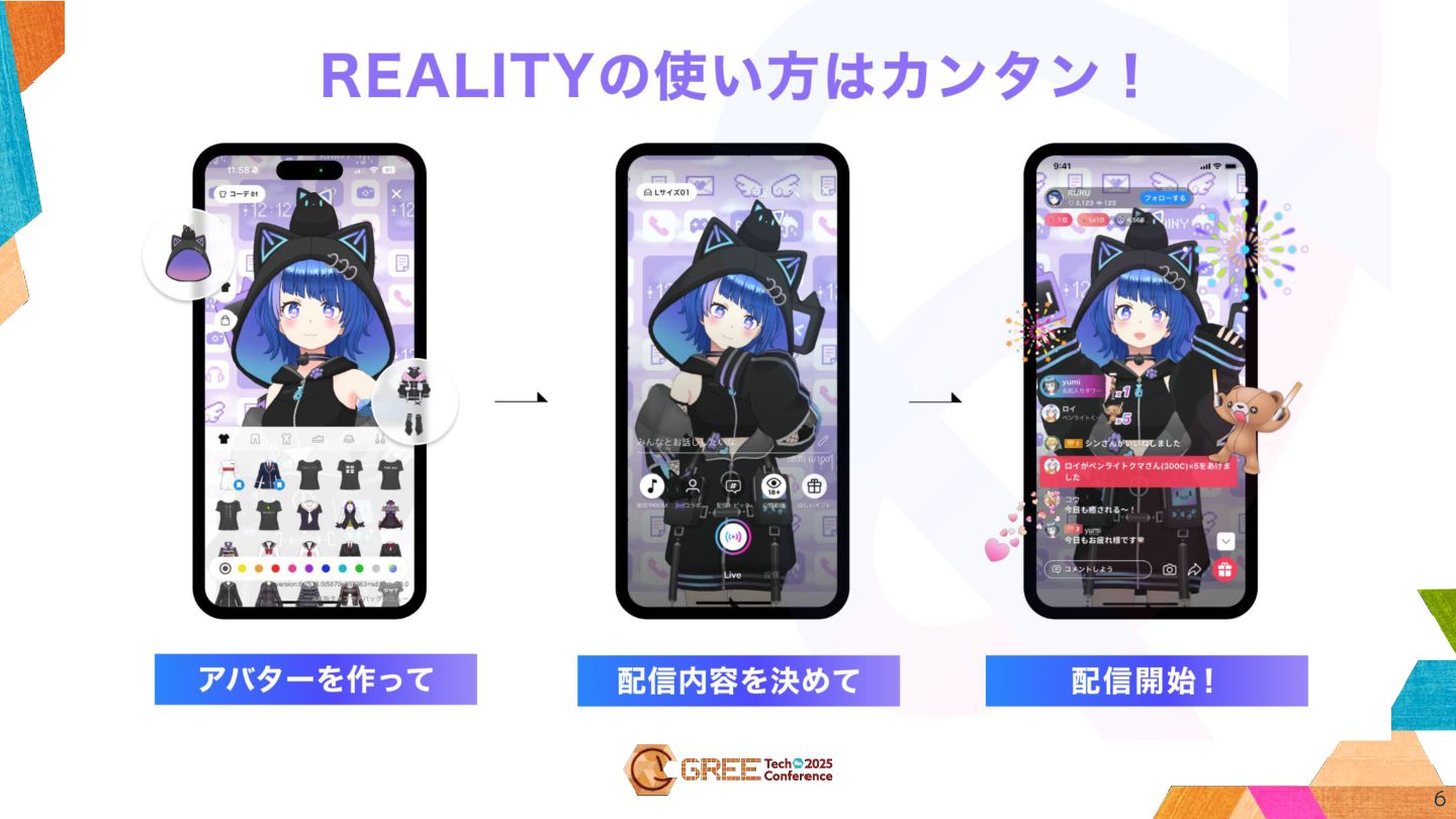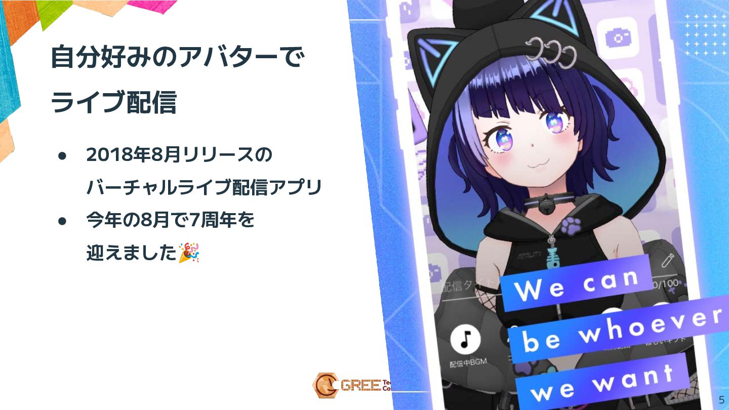 5 自分好みのアバターで ライブ配信 • 2018年8月リリースの バーチャルライブ配信アプリ • 今年の8月で7周年を 迎えました🎉
