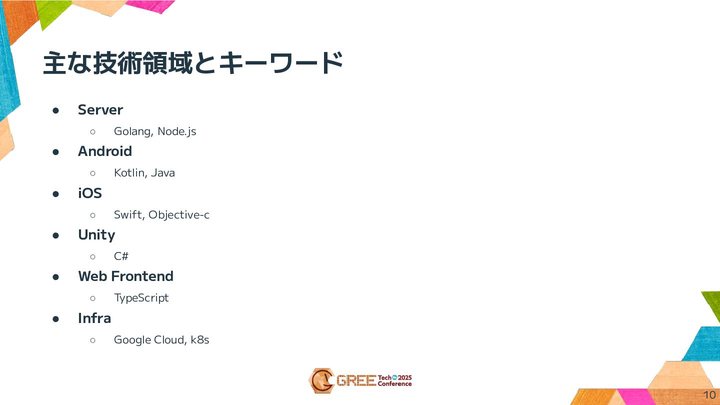 主な技術領域とキーワード • Server ◦ Golang, Node.js • Android ◦ Kotlin,