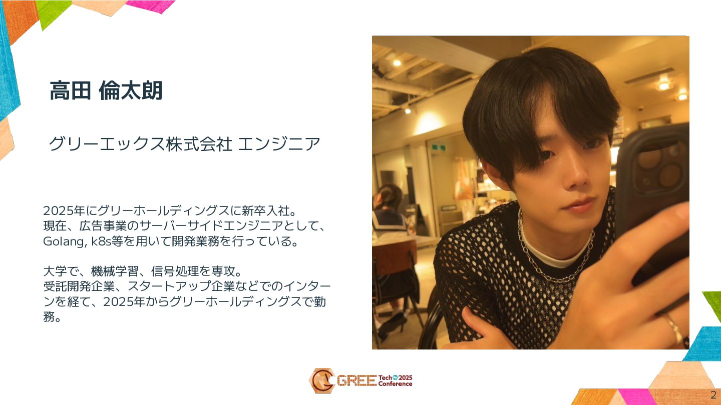 高田 倫太朗 2025年にグリーホールディングスに新卒入社。 現在、広告事業のサーバーサイドエンジニアとして、 Golang, k8s等を用いて開発業務を行っている。 大学で、機械学習、信号処理を専攻。 受託開発企業、スタートアップ企業などでのインター ンを経て、2025年からグリーホールディングスで勤 務。