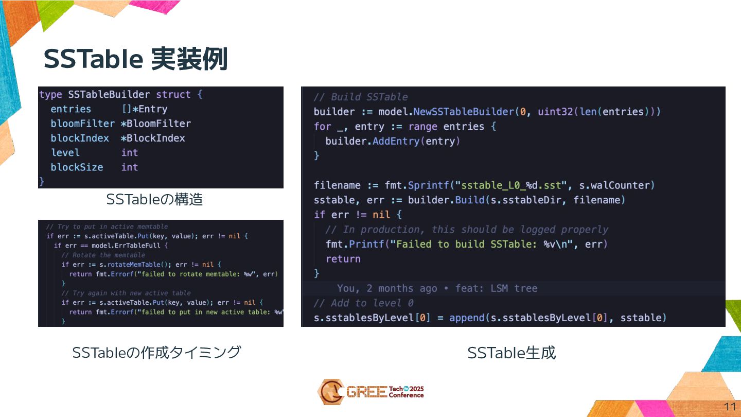 • SSTableはシーケンシャルに生成 • データを読み取る際は複数の SSTableを閲覧して、timestamp が新しいデータを取得する 10 Key Value Entry Type Timestamp apple 100 PUT 2025-10-02 01:35:20 banana 120 PUT 2025-10-02 01:40:24 peach null DELETE 2025-10-02 01:35:57 orange 80 PUT 2025-10-02 06:00:28 SSTable データ例 SSTable
