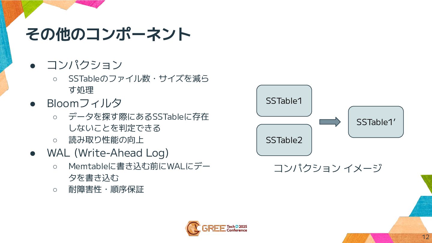 しないことを判定できる ◦ 読み取り性能の向上 • WAL (Write-Ahead Log) ◦ Memtableに書き込む前にWALにデー タを書き込む ◦ 耐障害性・順序保証 12 コンパクション イメージ SSTable1 SSTable2 SSTable1’