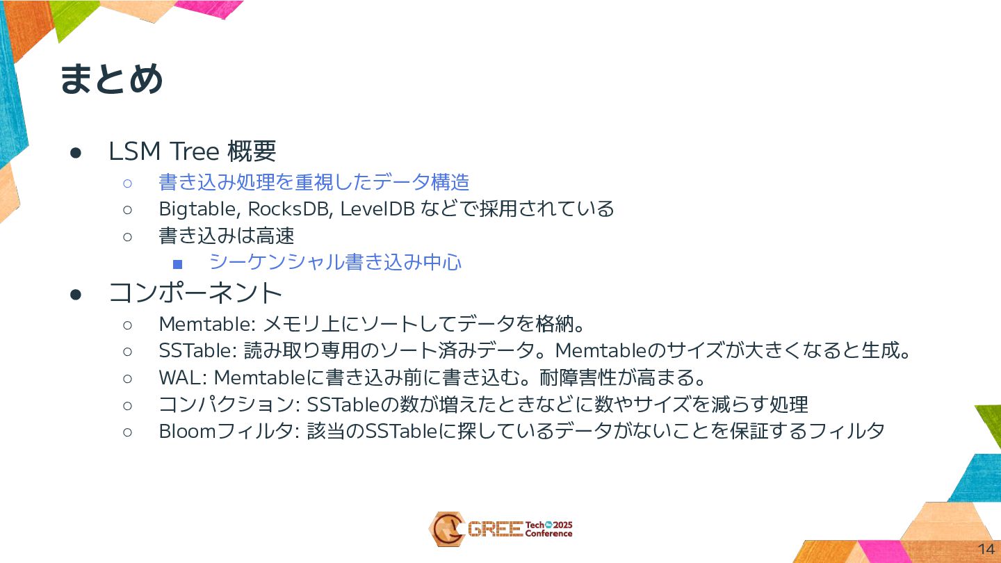 まとめ • LSM Tree 概要 ◦ 書き込み処理を重視したデータ構造 ◦ Bigtable, RocksDB,