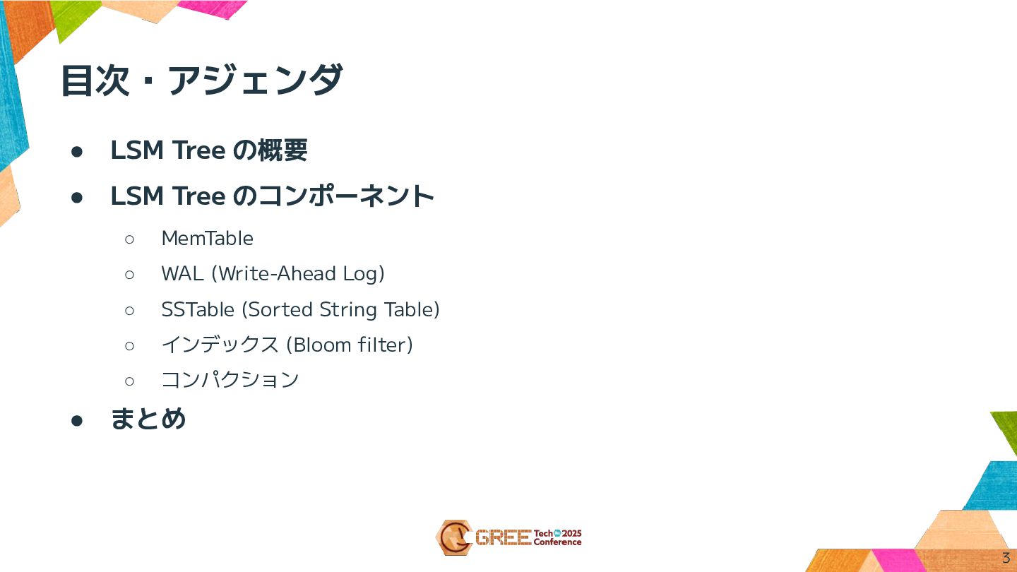 MemTable ◦ WAL (Write-Ahead Log) ◦ SSTable (Sorted String Table) ◦ インデックス (Bloom filter) ◦ コンパクション • まとめ 3