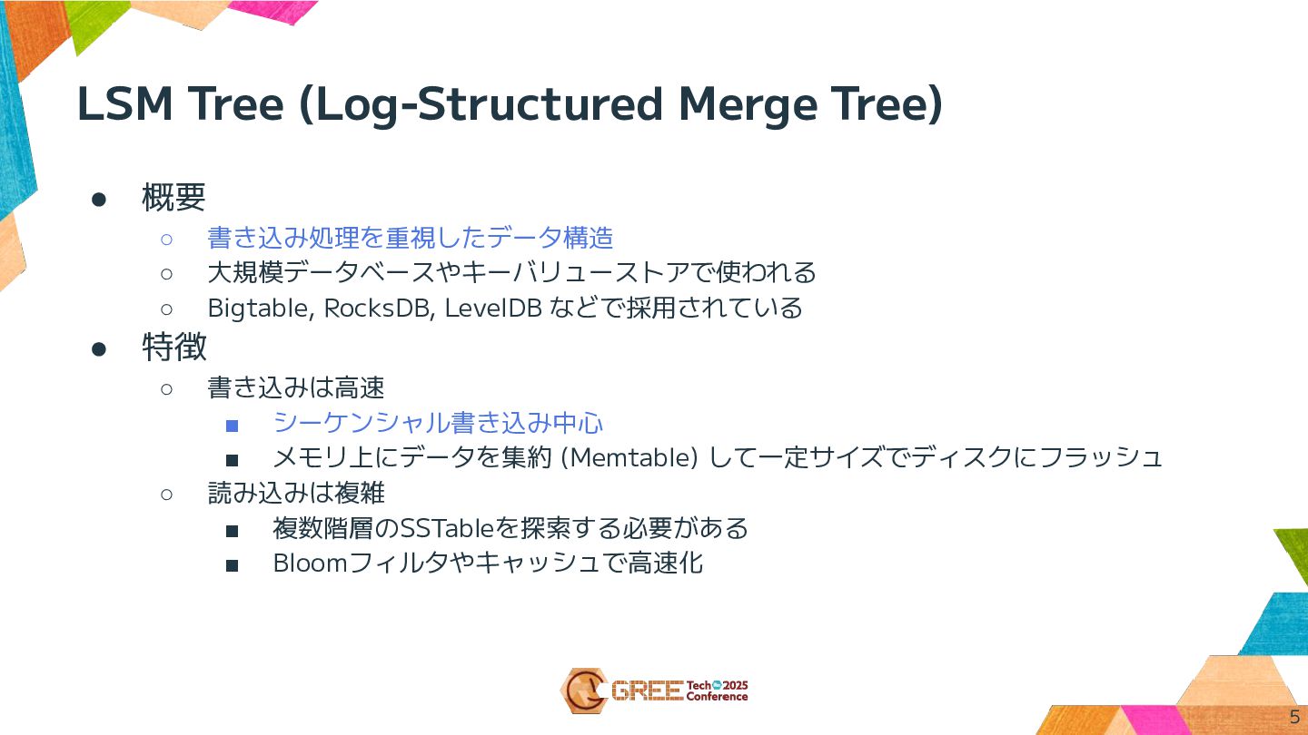 LSM Tree (Log-Structured Merge Tree) • 概要 ◦ 書き込み処理を重視したデータ構造 ◦