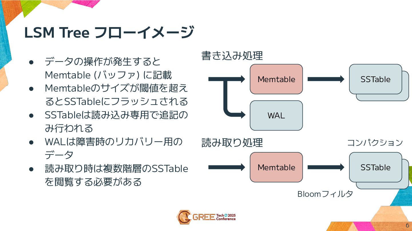 大規模データベースやキーバリューストアで使われる ◦ Bigtable, RocksDB, LevelDB などで採用されている • 特徴 ◦ 書き込みは高速 ▪ シーケンシャル書き込み中心 ▪ メモリ上にデータを集約 (Memtable) して一定サイズでディスクにフラッシュ ◦ 読み込みは複雑 ▪ 複数階層のSSTableを探索する必要がある ▪ Bloomフィルタやキャッシュで高速化 5