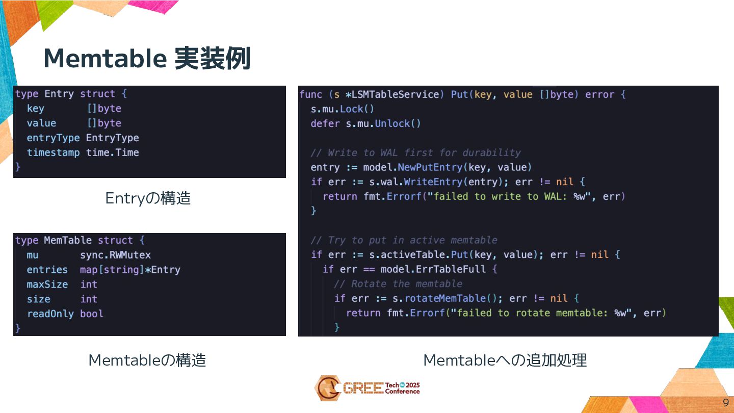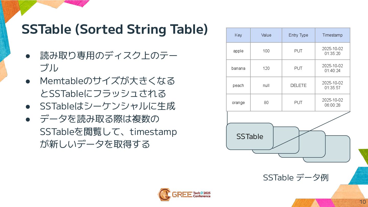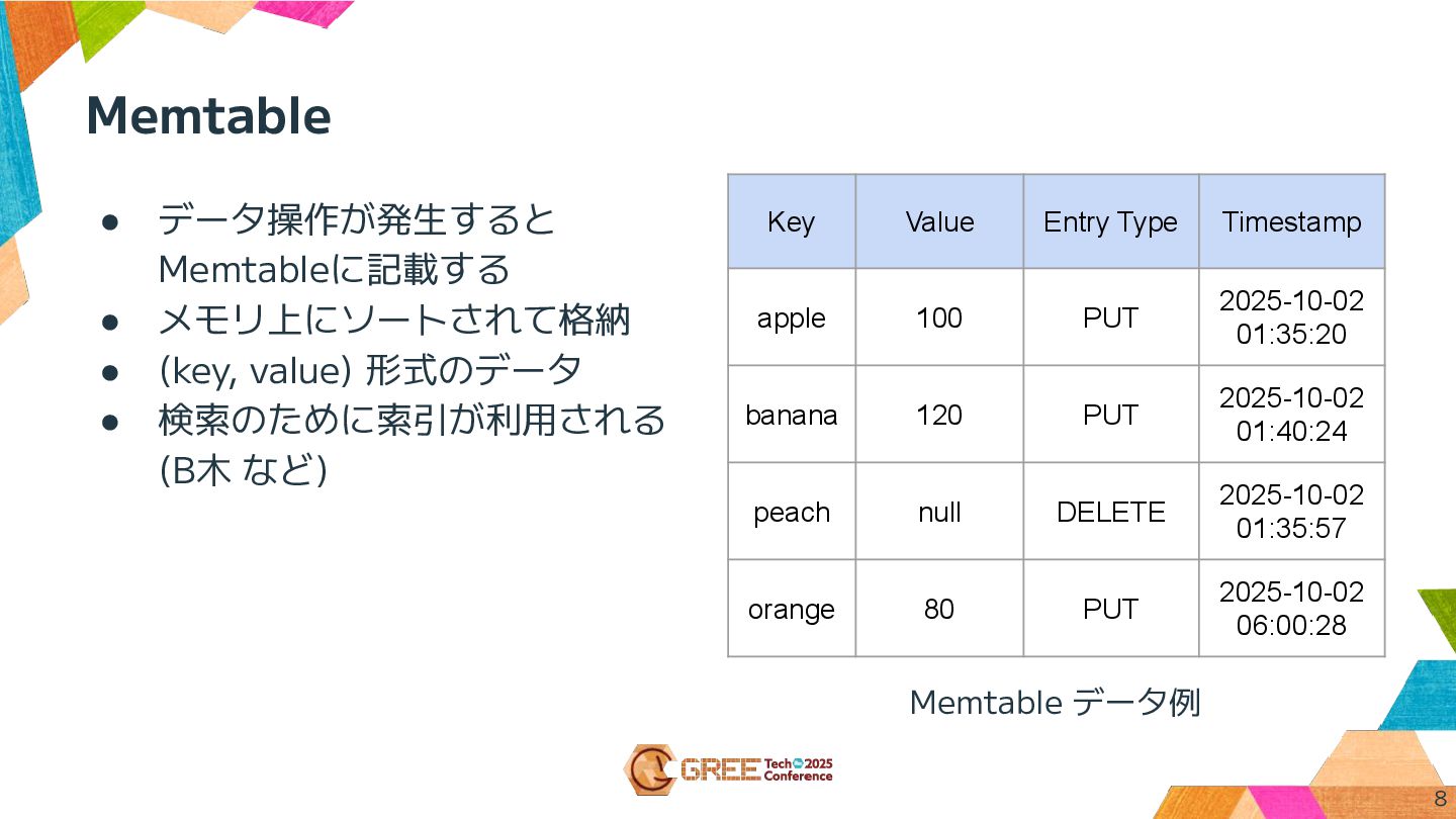 • 検索のために索引が利用される (B木 など) 8 Key Value Entry Type Timestamp apple 100 PUT 2025-10-02 01:35:20 banana 120 PUT 2025-10-02 01:40:24 peach null DELETE 2025-10-02 01:35:57 orange 80 PUT 2025-10-02 06:00:28 Memtable データ例