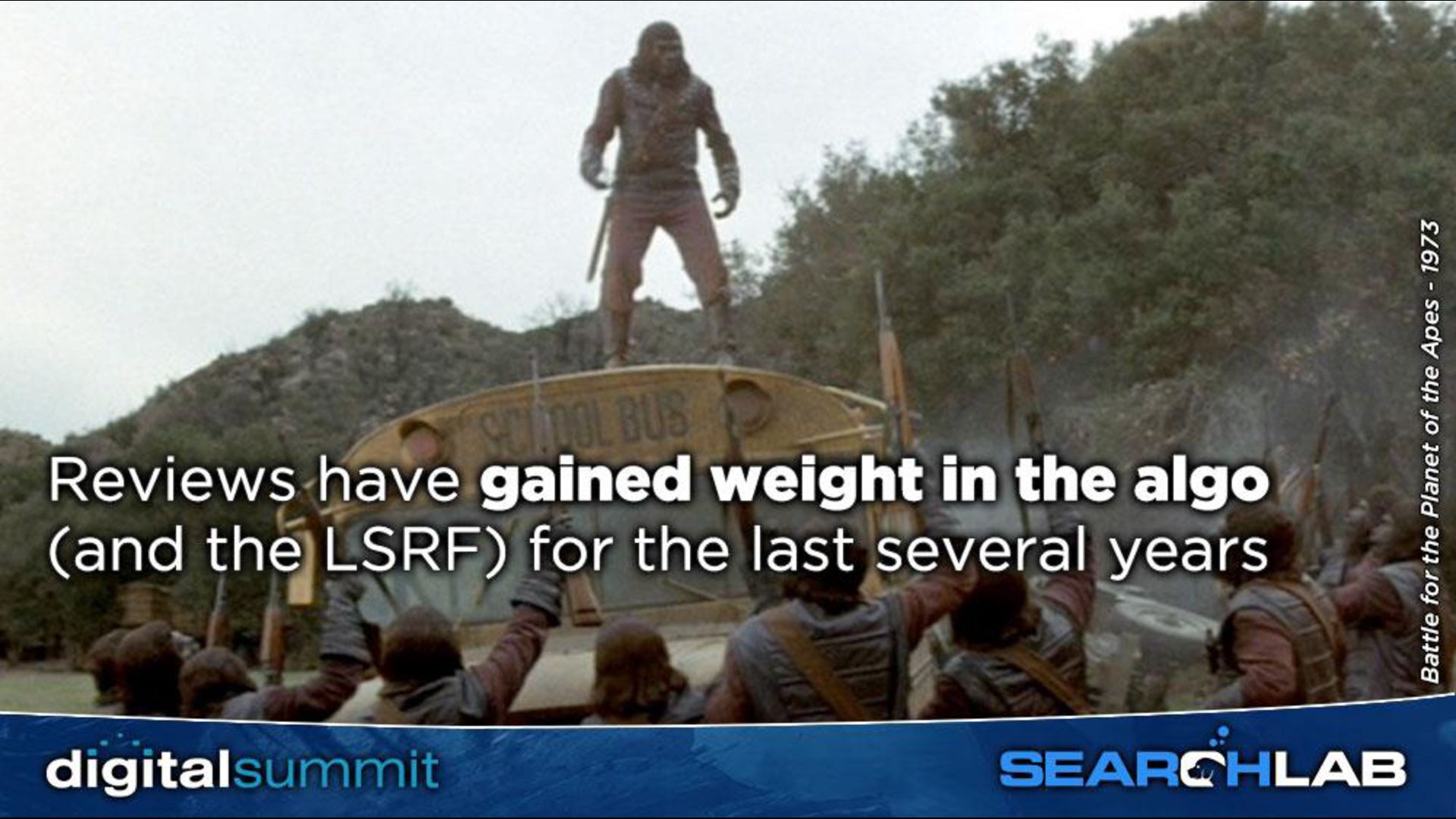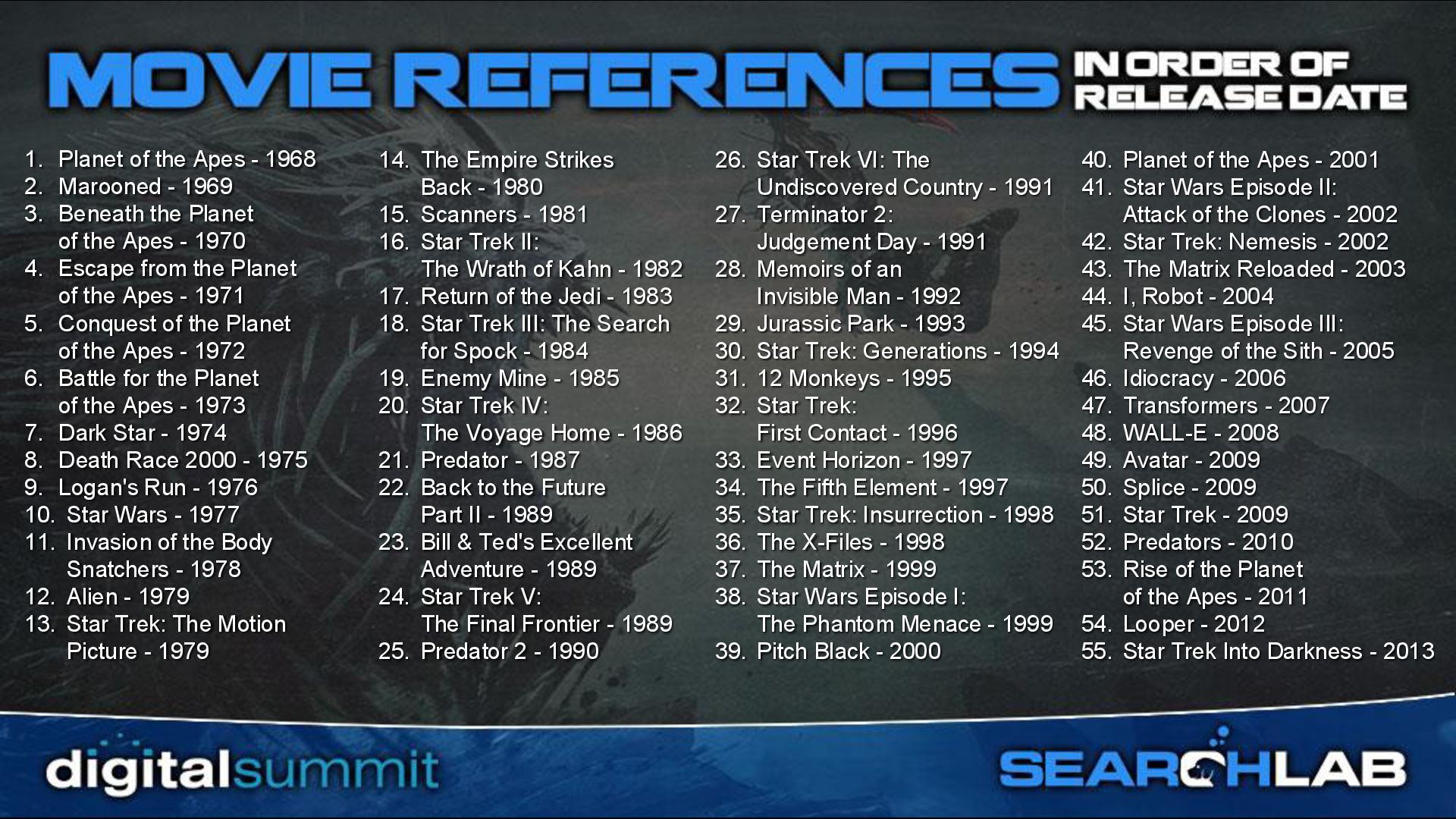 - 1969 3. Beneath the Planet of the Apes - 1970 4. Escape from the Planet of the Apes - 1971 5. Conquest of the Planet of the Apes - 1972 6. Battle for the Planet of the Apes - 1973 7. Dark Star - 1974 8. Death Race 2000 - 1975 9. Logan's Run - 1976 10. Star Wars - 1977 11. Invasion of the Body Snatchers - 1978 12. Alien - 1979 13. Star Trek: The Motion Picture - 1979 14. The Empire Strikes Back - 1980 15. Scanners - 1981 16. Star Trek II: The Wrath of Kahn - 1982 17. Return of the Jedi - 1983 18. Star Trek III: The Search for Spock - 1984 19. Enemy Mine - 1985 20. Star Trek IV: The Voyage Home - 1986 21. Predator - 1987 22. Back to the Future Part II - 1989 23. Bill & Ted's Excellent Adventure - 1989 24. Star Trek V: The Final Frontier - 1989 25. Predator 2 - 1990 26. Star Trek VI: The Undiscovered Country - 1991 27. Terminator 2: Judgement Day - 1991 28. Memoirs of an Invisible Man - 1992 29. Jurassic Park - 1993 30. Star Trek: Generations - 1994 31. 12 Monkeys - 1995 32. Star Trek: First Contact - 1996 33. Event Horizon - 1997 34. The Fifth Element - 1997 35. Star Trek: Insurrection - 1998 36. The X-Files - 1998 37. The Matrix - 1999 38. Star Wars Episode I: The Phantom Menace - 1999 39. Pitch Black - 2000 40. Planet of the Apes - 2001 41. Star Wars Episode II: Attack of the Clones - 2002 42. Star Trek: Nemesis - 2002 43. The Matrix Reloaded - 2003 44. I, Robot - 2004 45. Star Wars Episode III: Revenge of the Sith - 2005 46. Idiocracy - 2006 47. Transformers - 2007 48. WALL-E - 2008 49. Avatar - 2009 50. Splice - 2009 51. Star Trek - 2009 52. Predators - 2010 53. Rise of the Planet of the Apes - 2011 54. Looper - 2012 55. Star Trek Into Darkness - 2013