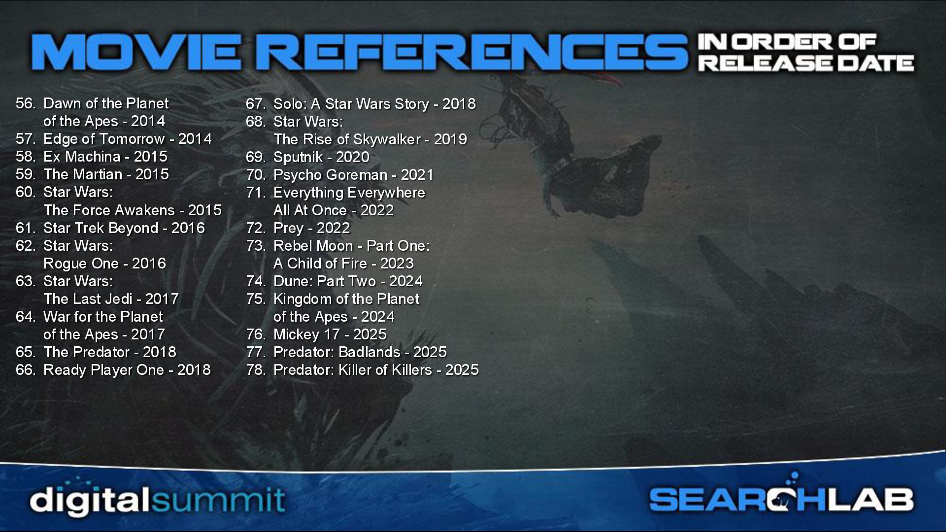 2014 57. Edge of Tomorrow - 2014 58. Ex Machina - 2015 59. The Martian - 2015 60. Star Wars: The Force Awakens - 2015 61. Star Trek Beyond - 2016 62. Star Wars: Rogue One - 2016 63. Star Wars: The Last Jedi - 2017 64. War for the Planet of the Apes - 2017 65. The Predator - 2018 66. Ready Player One - 2018 67. Solo: A Star Wars Story - 2018 68. Star Wars: The Rise of Skywalker - 2019 69. Sputnik - 2020 70. Psycho Goreman - 2021 71. Everything Everywhere All At Once - 2022 72. Prey - 2022 73. Rebel Moon - Part One: A Child of Fire - 2023 74. Dune: Part Two - 2024 75. Kingdom of the Planet of the Apes - 2024 76. Mickey 17 - 2025 77. Predator: Badlands - 2025 78. Predator: Killer of Killers - 2025