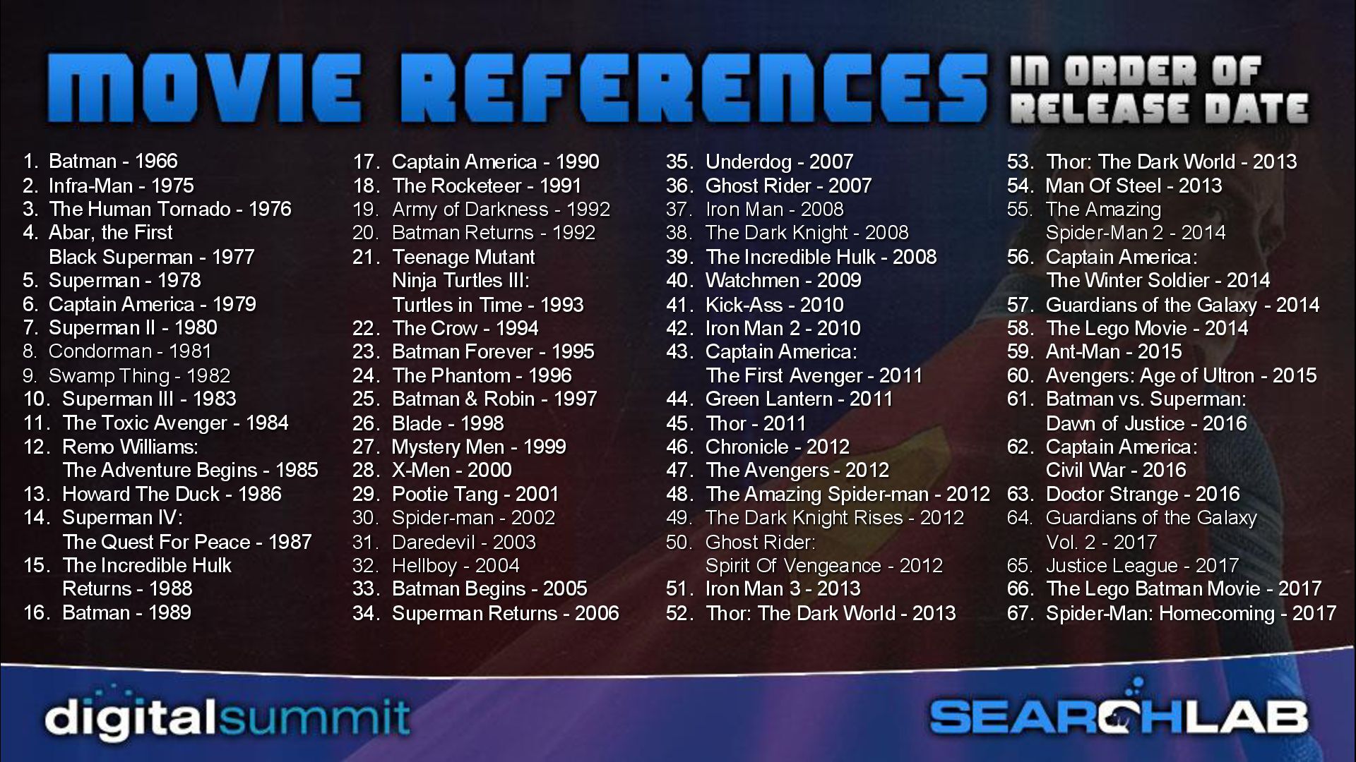 The Human Tornado - 1976 4. Abar, the First Black Superman - 1977 5. Superman - 1978 6. Captain America - 1979 7. Superman II - 1980 8. Condorman - 1981 9. Swamp Thing - 1982 10. Superman III - 1983 11. The Toxic Avenger - 1984 12. Remo Williams: The Adventure Begins - 1985 13. Howard The Duck - 1986 14. Superman IV: The Quest For Peace - 1987 15. The Incredible Hulk Returns - 1988 16. Batman - 1989 17. Captain America - 1990 18. The Rocketeer - 1991 19. Army of Darkness - 1992 20. Batman Returns - 1992 21. Teenage Mutant Ninja Turtles III: Turtles in Time - 1993 22. The Crow - 1994 23. Batman Forever - 1995 24. The Phantom - 1996 25. Batman & Robin - 1997 26. Blade - 1998 27. Mystery Men - 1999 28. X-Men - 2000 29. Pootie Tang - 2001 30. Spider-man - 2002 31. Daredevil - 2003 32. Hellboy - 2004 33. Batman Begins - 2005 34. Superman Returns - 2006 35. Underdog - 2007 36. Ghost Rider - 2007 37. Iron Man - 2008 38. The Dark Knight - 2008 39. The Incredible Hulk - 2008 40. Watchmen - 2009 41. Kick-Ass - 2010 42. Iron Man 2 - 2010 43. Captain America: The First Avenger - 2011 44. Green Lantern - 2011 45. Thor - 2011 46. Chronicle - 2012 47. The Avengers - 2012 48. The Amazing Spider-man - 2012 49. The Dark Knight Rises - 2012 50. Ghost Rider: Spirit Of Vengeance - 2012 51. Iron Man 3 - 2013 52. Thor: The Dark World - 2013 53. Thor: The Dark World - 2013 54. Man Of Steel - 2013 55. The Amazing Spider-Man 2 - 2014 56. Captain America: The Winter Soldier - 2014 57. Guardians of the Galaxy - 2014 58. The Lego Movie - 2014 59. Ant-Man - 2015 60. Avengers: Age of Ultron - 2015 61. Batman vs. Superman: Dawn of Justice - 2016 62. Captain America: Civil War - 2016 63. Doctor Strange - 2016 64. Guardians of the Galaxy Vol. 2 - 2017 65. Justice League - 2017 66. The Lego Batman Movie - 2017 67. Spider-Man: Homecoming - 2017