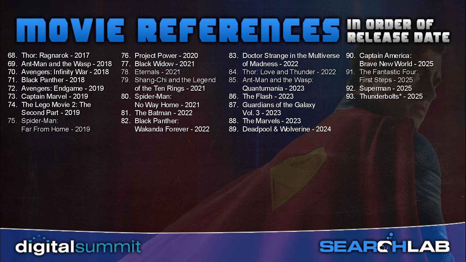 Wasp - 2018 70. Avengers: Infinity War - 2018 71. Black Panther - 2018 72. Avengers: Endgame - 2019 73. Captain Marvel - 2019 74. The Lego Movie 2: The Second Part - 2019 75. Spider-Man: Far From Home - 2019 76. Project Power - 2020 77. Black Widow - 2021 78. Eternals - 2021 79. Shang-Chi and the Legend of the Ten Rings - 2021 80. Spider-Man: No Way Home - 2021 81. The Batman - 2022 82. Black Panther: Wakanda Forever - 2022 83. Doctor Strange in the Multiverse of Madness - 2022 84. Thor: Love and Thunder - 2022 85. Ant-Man and the Wasp: Quantumania - 2023 86. The Flash - 2023 87. Guardians of the Galaxy Vol. 3 - 2023 88. The Marvels - 2023 89. Deadpool & Wolverine - 2024 90. Captain America: Brave New World - 2025 91. The Fantastic Four: First Steps - 2025 92. Superman - 2025 93. Thunderbolts* - 2025