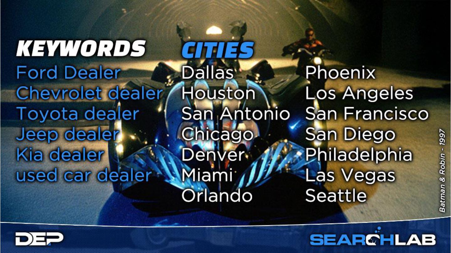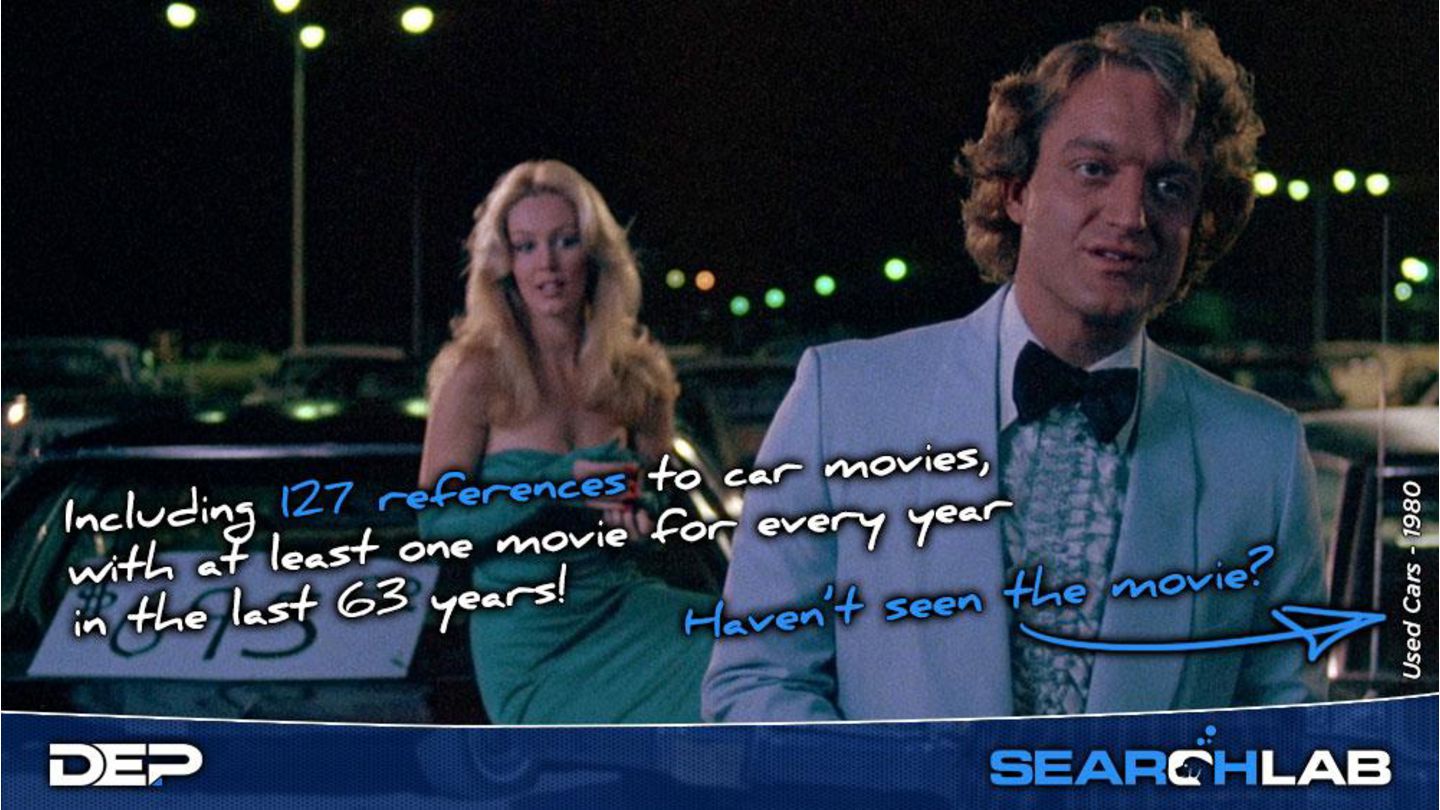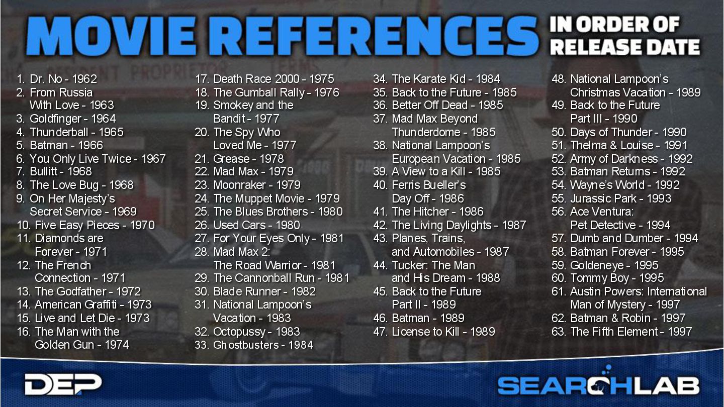 - 1963 3. Goldfinger - 1964 4. Thunderball - 1965 5. Batman - 1966 6. You Only Live Twice - 1967 7. Bullitt - 1968 8. The Love Bug - 1968 9. On Her Majesty’s Secret Service - 1969 10. Five Easy Pieces - 1970 11. Diamonds are Forever - 1971 12. The French Connection - 1971 13. The Godfather - 1972 14. American Graffiti - 1973 15. Live and Let Die - 1973 16. The Man with the Golden Gun - 1974 17. Death Race 2000 - 1975 18. The Gumball Rally - 1976 19. Smokey and the Bandit - 1977 20. The Spy Who Loved Me - 1977 21. Grease - 1978 22. Mad Max - 1979 23. Moonraker - 1979 24. The Muppet Movie - 1979 25. The Blues Brothers - 1980 26. Used Cars - 1980 27. For Your Eyes Only - 1981 28. Mad Max 2: The Road Warrior - 1981 29. The Cannonball Run - 1981 30. Blade Runner - 1982 31. National Lampoon’s Vacation - 1983 32. Octopussy - 1983 33. Ghostbusters - 1984 34. The Karate Kid - 1984 35. Back to the Future - 1985 36. Better Off Dead - 1985 37. Mad Max Beyond Thunderdome - 1985 38. National Lampoon’s European Vacation - 1985 39. A View to a Kill - 1985 40. Ferris Bueller’s Day Off - 1986 41. The Hitcher - 1986 42. The Living Daylights - 1987 43. Planes, Trains, and Automobiles - 1987 44. Tucker: The Man and His Dream - 1988 45. Back to the Future Part II - 1989 46. Batman - 1989 47. License to Kill - 1989 48. National Lampoon’s Christmas Vacation - 1989 49. Back to the Future Part III - 1990 50. Days of Thunder - 1990 51. Thelma & Louise - 1991 52. Army of Darkness - 1992 53. Batman Returns - 1992 54. Wayne’s World - 1992 55. Jurassic Park - 1993 56. Ace Ventura: Pet Detective - 1994 57. Dumb and Dumber - 1994 58. Batman Forever - 1995 59. Goldeneye - 1995 60. Tommy Boy - 1995 61. Austin Powers: International Man of Mystery - 1997 62. Batman & Robin - 1997 63. The Fifth Element - 1997