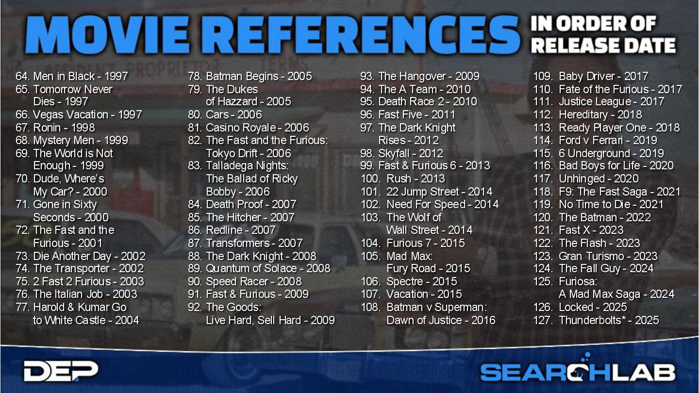 - 1997 66. Vegas Vacation - 1997 67. Ronin - 1998 68. Mystery Men - 1999 69. The World is Not Enough - 1999 70. Dude, Where’s My Car? - 2000 71. Gone in Sixty Seconds - 2000 72. The Fast and the Furious - 2001 73. Die Another Day - 2002 74. The Transporter - 2002 75. 2 Fast 2 Furious - 2003 76. The Italian Job - 2003 77. Harold & Kumar Go to White Castle - 2004 78. Batman Begins - 2005 79. The Dukes of Hazzard - 2005 80. Cars - 2006 81. Casino Royale - 2006 82. The Fast and the Furious: Tokyo Drift - 2006 83. Talladega Nights: The Ballad of Ricky Bobby - 2006 84. Death Proof - 2007 85. The Hitcher - 2007 86. Redline - 2007 87. Transformers - 2007 88. The Dark Knight - 2008 89. Quantum of Solace - 2008 90. Speed Racer - 2008 91. Fast & Furious - 2009 92. The Goods: Live Hard, Sell Hard - 2009 93. The Hangover - 2009 94. The A Team - 2010 95. Death Race 2 - 2010 96. Fast Five - 2011 97. The Dark Knight Rises - 2012 98. Skyfall - 2012 99. Fast & Furious 6 - 2013 100. Rush - 2013 101. 22 Jump Street - 2014 102. Need For Speed - 2014 103. The Wolf of Wall Street - 2014 104. Furious 7 - 2015 105. Mad Max: Fury Road - 2015 106. Spectre - 2015 107. Vacation - 2015 108. Batman v Superman: Dawn of Justice - 2016 109. Baby Driver - 2017 110. Fate of the Furious - 2017 111. Justice League - 2017 112. Hereditary - 2018 113. Ready Player One - 2018 114. Ford v Ferrari - 2019 115. 6 Underground - 2019 116. Bad Boys for Life - 2020 117. Unhinged - 2020 118. F9: The Fast Saga - 2021 119. No Time to Die - 2021 120. The Batman - 2022 121. Fast X - 2023 122. The Flash - 2023 123. Gran Turismo - 2023 124. The Fall Guy - 2024 125. Furiosa: A Mad Max Saga - 2024 126. Locked - 2025 127. Thunderbolts* - 2025