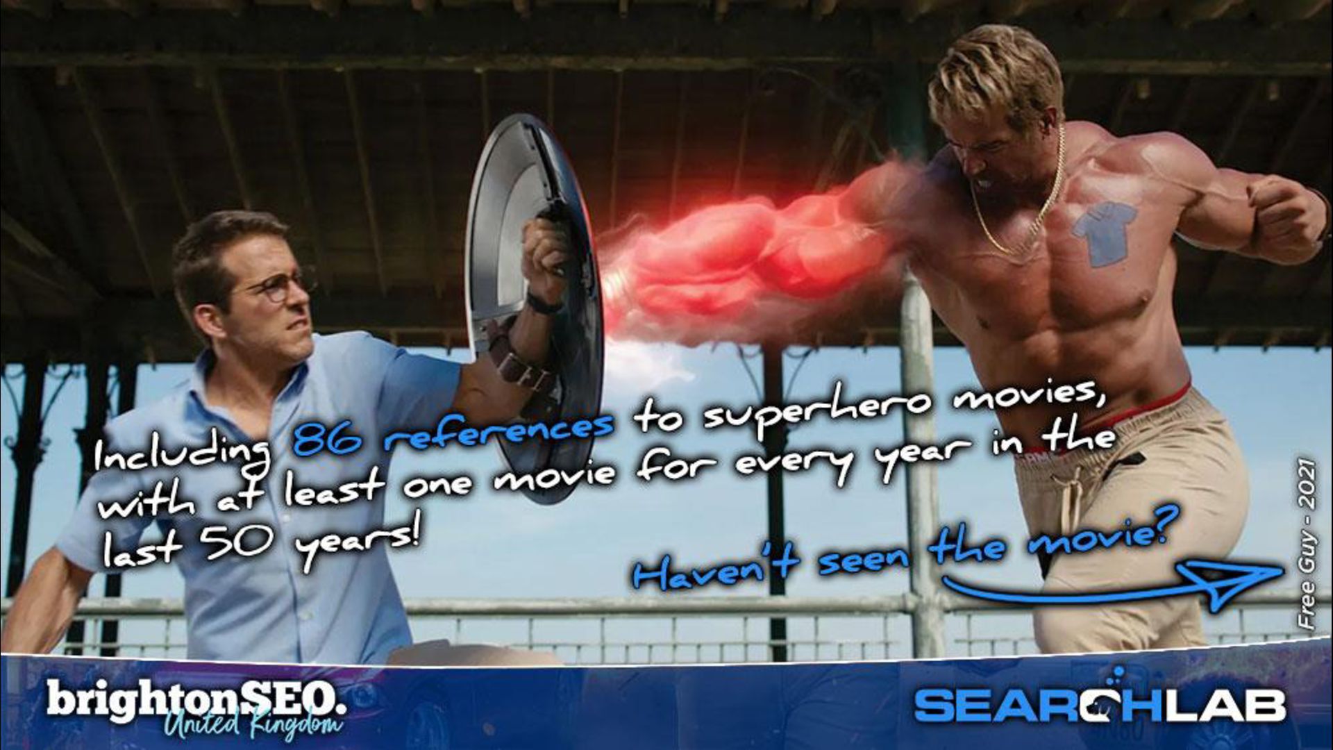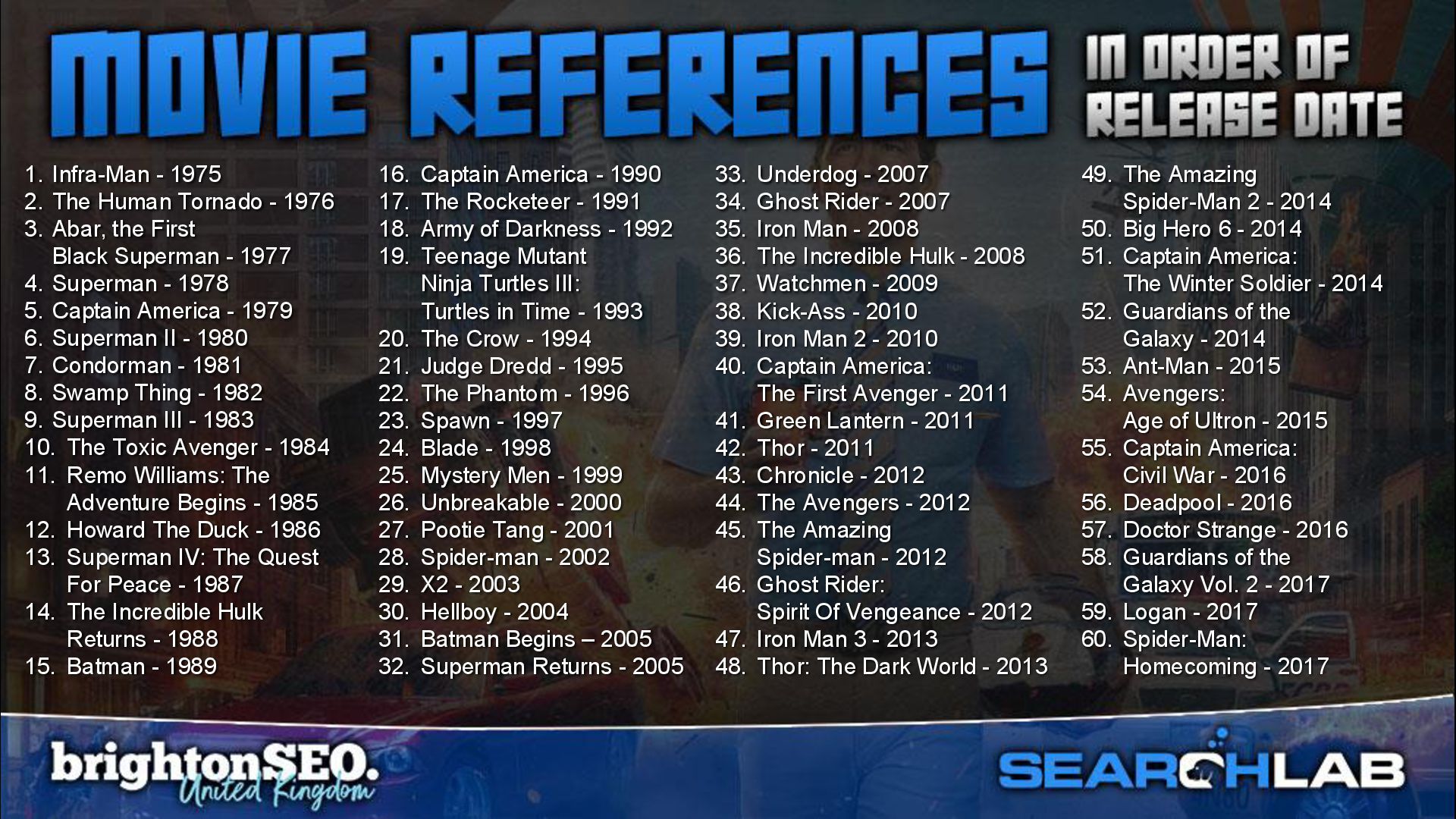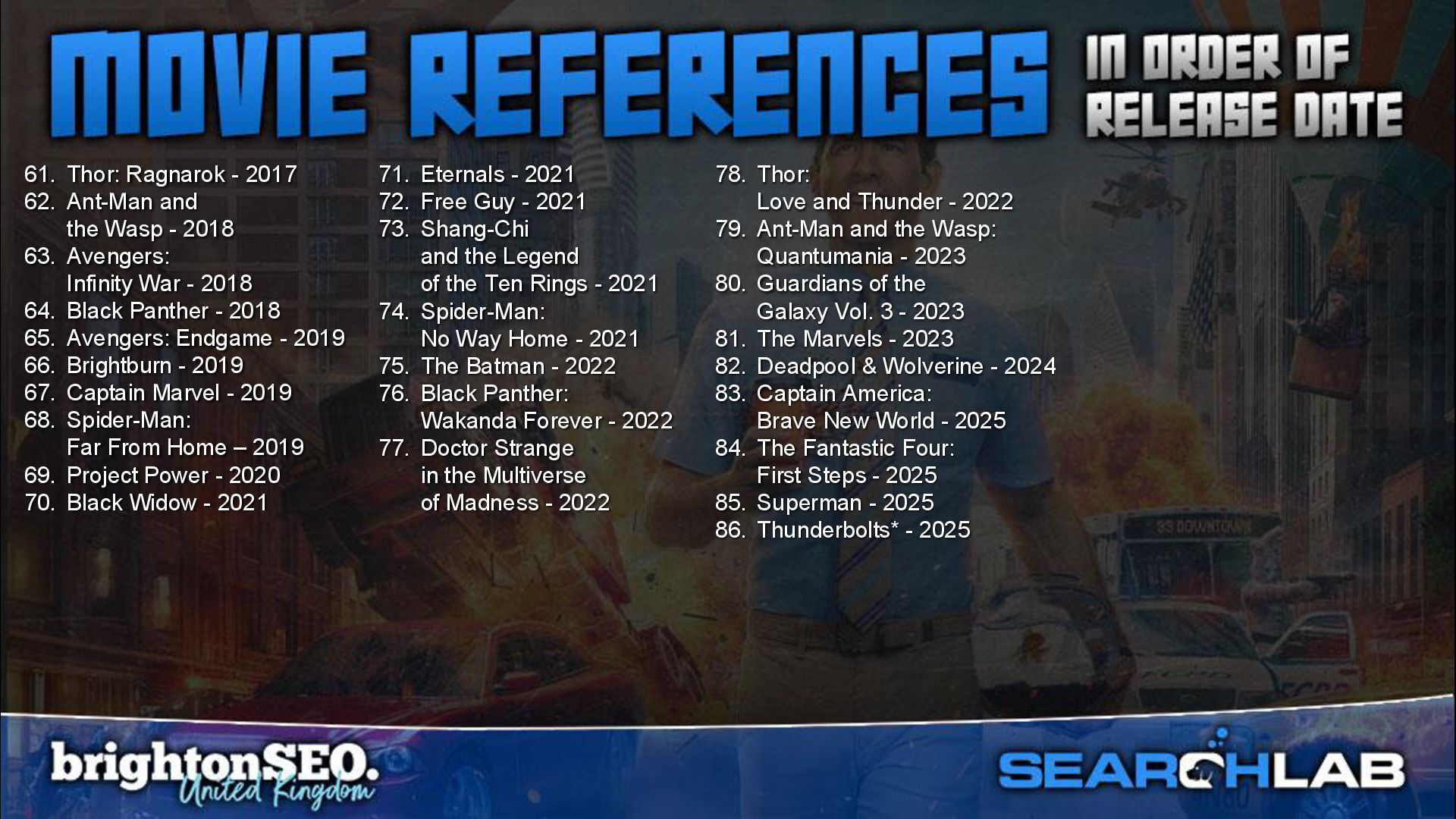 Wasp - 2018 63. Avengers: Infinity War - 2018 64. Black Panther - 2018 65. Avengers: Endgame - 2019 66. Brightburn - 2019 67. Captain Marvel - 2019 68. Spider-Man: Far From Home – 2019 69. Project Power - 2020 70. Black Widow - 2021 71. Eternals - 2021 72. Free Guy - 2021 73. Shang-Chi and the Legend of the Ten Rings - 2021 74. Spider-Man: No Way Home - 2021 75. The Batman - 2022 76. Black Panther: Wakanda Forever - 2022 77. Doctor Strange in the Multiverse of Madness - 2022 78. Thor: Love and Thunder - 2022 79. Ant-Man and the Wasp: Quantumania - 2023 80. Guardians of the Galaxy Vol. 3 - 2023 81. The Marvels - 2023 82. Deadpool & Wolverine - 2024 83. Captain America: Brave New World - 2025 84. The Fantastic Four: First Steps - 2025 85. Superman - 2025 86. Thunderbolts* - 2025