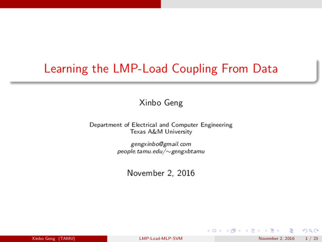 is the relationship between loads and LMPs? The relationship between Locational Marginal Prices (LMPs) and Loads A fundamental question. Understand electricity market operations. Benefit both system operators and market participants. Xinbo Geng (TAMU) LMP-Load-MLP-SVM November 2, 2016 3 / 23