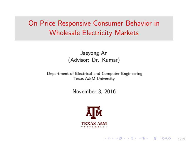 modeling price responsive electricity demand. Conclusion The price responsiveness of demand has qualitatively different behavior during normal price and peak price periods. - A moderate price has very little impact with respect to eliciting demand response. - A price spike has a considerable but delayed impact in eliciting demand response. Future Works Design of effective pricing to close loop around demand response. 11/13