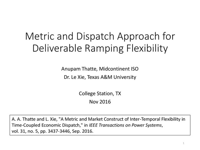 Midcontinent ISO Dr. Le Xie, Texas A&M University College Station, TX Nov 2016 1 A. A. Thatte and L. Xie, "A Metric and Market Construct of Inter-Temporal Flexibility in Time-Coupled Economic Dispatch," in IEEE Transactions on Power Systems, vol. 31, no. 5, pp. 3437-3446, Sep. 2016.