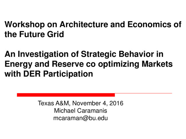 Investigation of Strategic Behavior in Energy and Reserve co optimizing Markets with DER Participation Texas A&M, November 4, 2016 Michael Caramanis [email protected]
