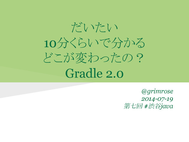 だいたい 10分くらいで分かる どこが変わったの? Gradle 2.0 @grimrose 2014-07-19 第七回 #渋谷java