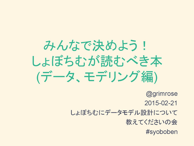 みんなで決めよう! しょぼちむが読むべき本 (データ、モデリング編) @grimrose 2015-02-21 しょぼちむにデータモデル設計について 教えてくださいの会 #syoboben
