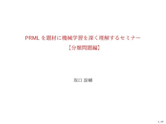 X) Λ ٻΊΔ͜ͱ͕తͱͳΔɻ (3.14) ΑΓɺͦͷ༧ଌ p(t|x, t, X) ॏΈ w ͷੵͰҎԼͷΑ͏ʹ ͔͚Δɻ p(t|x, t, X) = ∫ p(t|x, w)p(w|t, X) dw (3.15) ͜͜Ͱɺp(t|x, w) ؔͰ͋Γɺp(w|t, X) ύϥϝʔλͷࣄޙ Ͱ͋Δɻ ಛʹࠓճೋྨΛߟ͍͑ͯΔͷͰɺ֬ p(C1 |x, t, X) = ∫ p(C1 |x, w)p(w|t, X) dw (3.16) ͚ͩΛੵͯ͠ٻΊͯɺp(C2 |x, t, X) p(C2 |x, t, X) = 1 − p(C1 |x, t, X) (3.17) ͷΑ͏ʹن֨Խ͔݅ΒٻΊΔ͜ͱΛߟ͑Δɻ 31 / 47