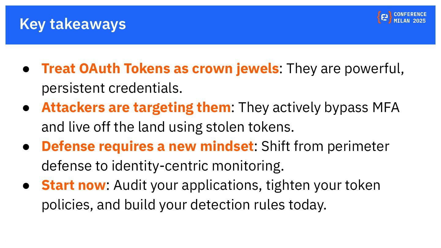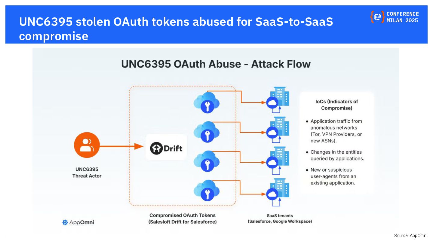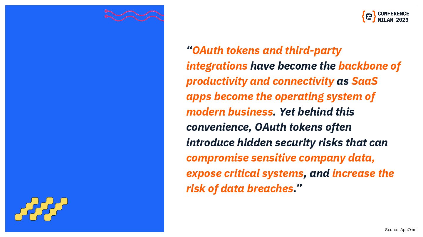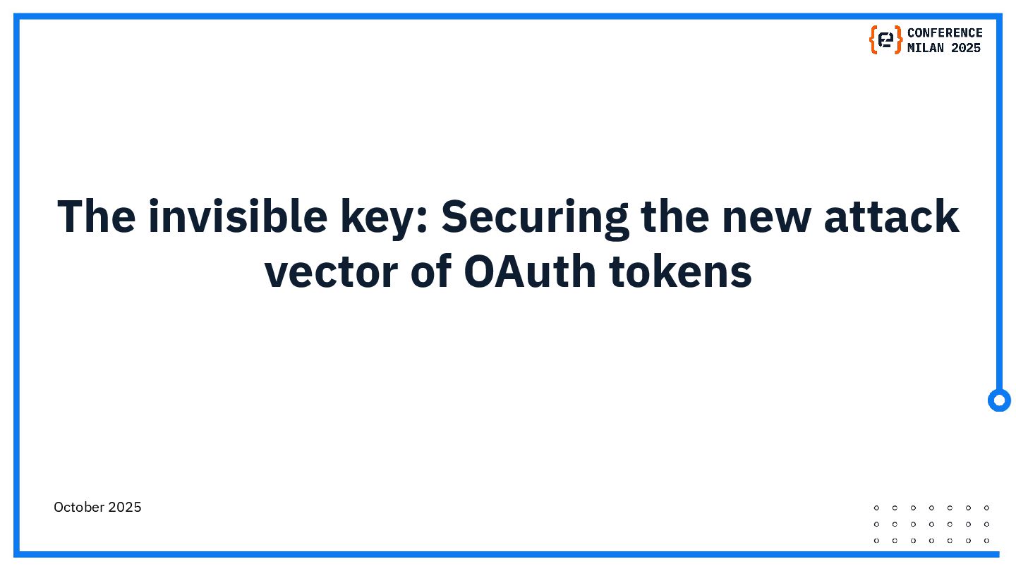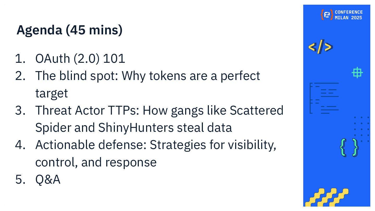OAuth tokens are the new crown jewels. Once issued, they bypass MFA and give API-level access that is hard to monitor. The opaque nature of their use and the difficulty in monitoring their activity create a dangerous blind spot for security teams, making them a primary target for attackers. This presentation will delve into the lifecycle of OAuth tokens, explore real-world attack vectors, and provide actionable strategies for protecting these high-value assets. We will also review the tactics, techniques, and procedures (TTPs) of notorious gangs like ShinyHunters and Scattered Spider, as demonstrated in the 2025 Salesforce attacks.
